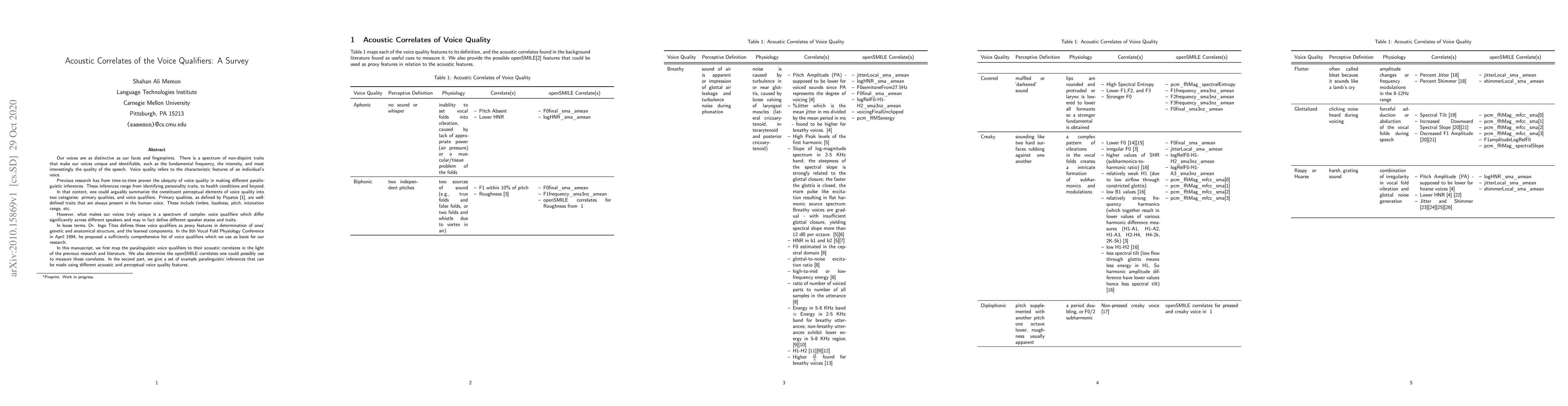 Our voices are as distinctive as our faces and fingerprints. There is a spectrum of non-disjoint traits that make our voices unique and identifiable, such as the fundamental frequency, the intensity, and most interestingly the quality of the speech. Voice quality refers to the characteristic features of an individual's voice. Previous research has from time-to-time proven the ubiquity of voice quality in making different paralinguistic inferences. These inferences range from identifying personality traits, to health conditions and beyond. In this manuscript, we first map the paralinguistic voice qualifiers to their acoustic correlates in the light of the previous research and literature. We also determine the openSMILE correlates one could possibly use to measure those correlates. In the second part, we give a set of example paralinguistic inferences that can be made using different acoustic and perceptual voice quality features.