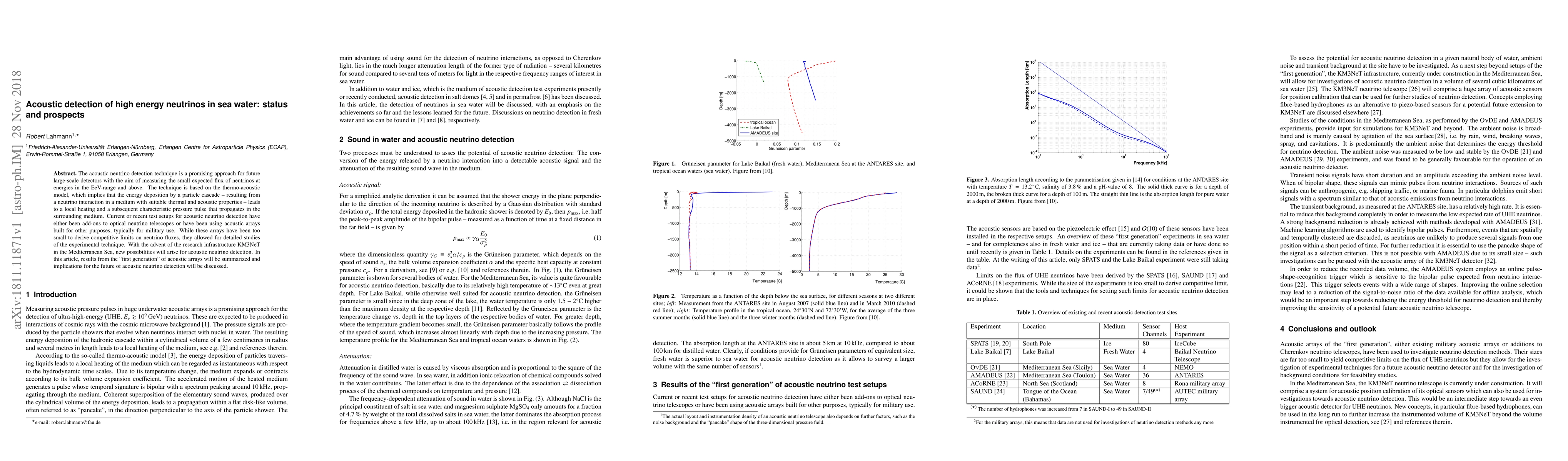 The acoustic neutrino detection technique is a promising approach for future large-scale detectors with the aim of measuring the small expected flux of neutrinos at energies in the EeV-range and above. The technique is based on the thermo-acoustic model, which implies that the energy deposition by a particle cascade - resulting from a neutrino interaction in a medium with suitable thermal and acoustic properties - leads to a local heating and a subsequent characteristic pressure pulse that propagates in the surrounding medium. Current or recent test setups for acoustic neutrino detection have either been add-ons to optical neutrino telescopes or have been using acoustic arrays built for other purposes, typically for military use. While these arrays have been too small to derive competitive limits on neutrino fluxes, they allowed for detailed studies of the experimental technique. With the advent of the research infrastructure KM3NeT in the Mediterranean Sea, new possibilities will arise for acoustic neutrino detection. In this article, results from the "first generation" of acoustic arrays will be summarized and implications for the future of acoustic neutrino detection will be discussed.