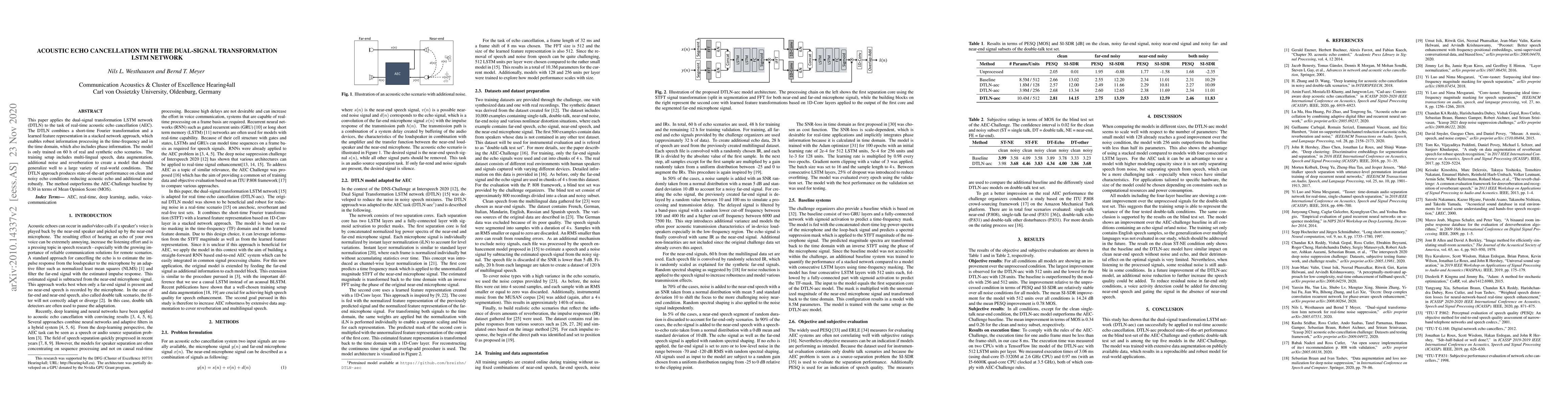 This paper introduces a dual-signal transformation LSTM network for real-time acoustic echo cancellation, achieving state-of-the-art performance by combining short-time Fourier transformation and learned feature representation. The model, trained on 60 hours of real and synthetic data, outperforms the AEC-Challenge baseline by 0.30 in Mean Opinion Score.