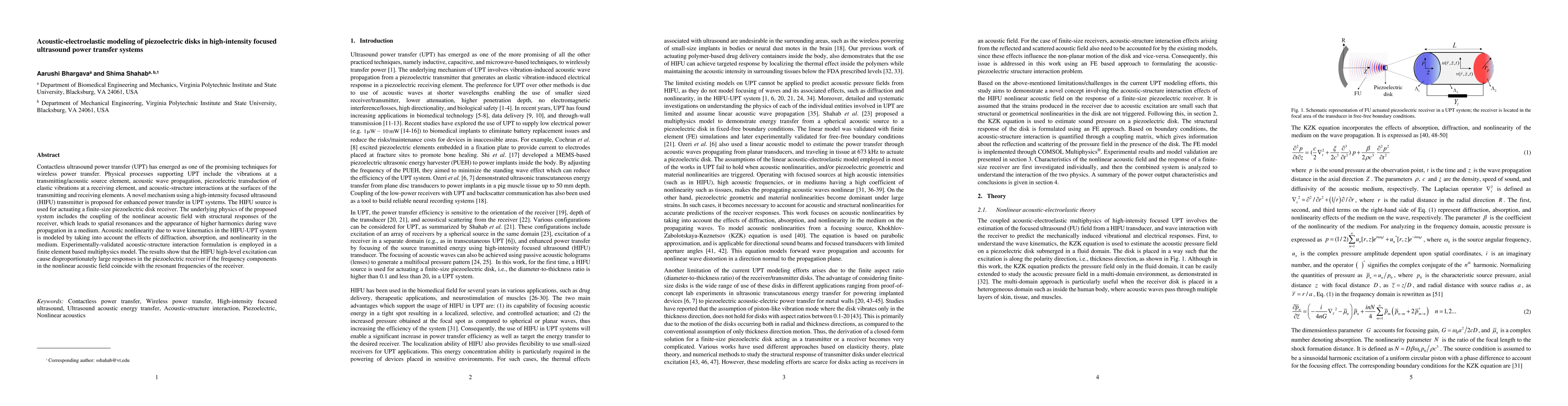 Contactless ultrasound power transfer (UPT) has emerged as one of the promising techniques for wireless power transfer. Physical processes supporting UPT include the vibrations at a transmitting/acoustic source element, acoustic wave propagation, piezoelectric transduction of elastic vibrations at a receiving element, and acoustic-structure interactions at the surfaces of the transmitting and receiving elements. A novel mechanism using a high-intensity focused ultrasound (HIFU) transmitter is proposed for enhanced power transfer in UPT systems. The HIFU source is used for actuating a finite-size piezoelectric disk receiver. The underlying physics of the proposed system includes the coupling of the nonlinear acoustic field with structural responses of the receiver, which leads to spatial resonances and the appearance of higher harmonics during wave propagation in a medium. Acoustic nonlinearity due to wave kinematics in the HIFU-UPT system is modeled by taking into account the effects of diffraction, absorption, and nonlinearity in the medium. Experimentally-validated acoustic-structure interaction formulation is employed in a finite element based multiphysics model. The results show that the HIFU high-level excitation can cause disproportionately large responses in the piezoelectric receiver if the frequency components in the nonlinear acoustic field coincide with the resonant frequencies of the receiver.