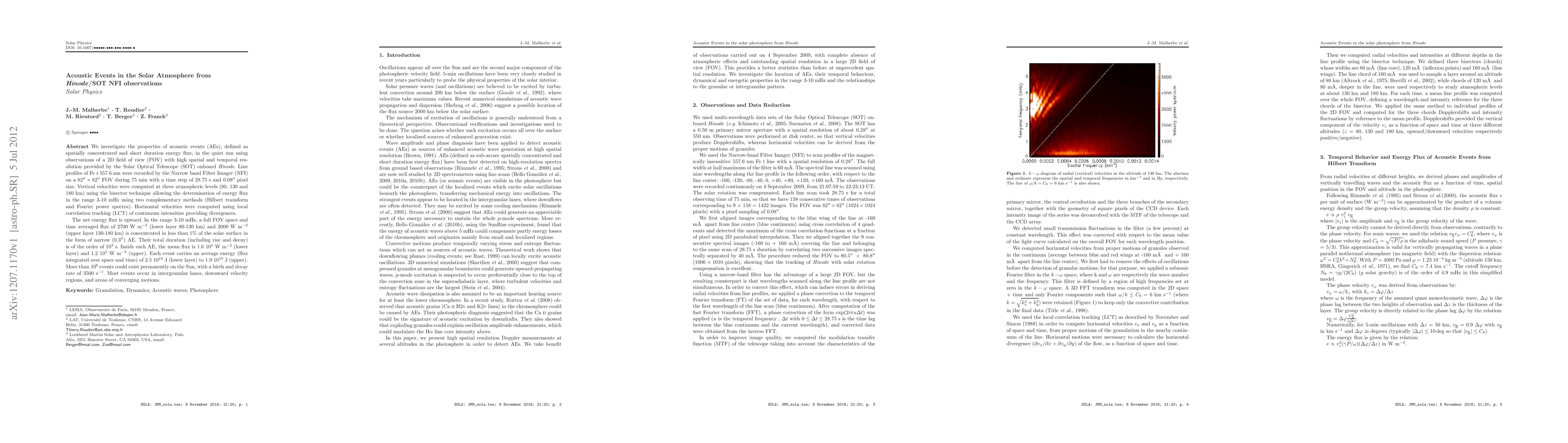 Researchers observed and analyzed acoustic events in the Sun's atmosphere using Hinode/SOT NFI data, finding a high concentration of energy flux in narrow regions with durations of thousands of seconds.