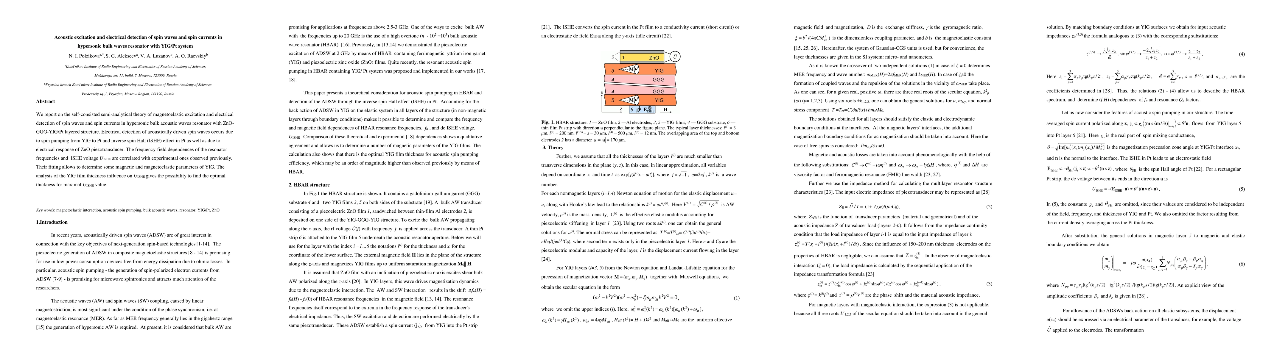 This research develops a semi-analytical theory for magnetoelastic excitation and electrical detection of spin waves in a hypersonic resonator with a ZnO-GGG-YIG/Pt structure, correlating theoretical and experimental observations to determine magnetic parameters. It also finds the optimal YIG film thickness for maximal inverse spin Hall effect voltage.