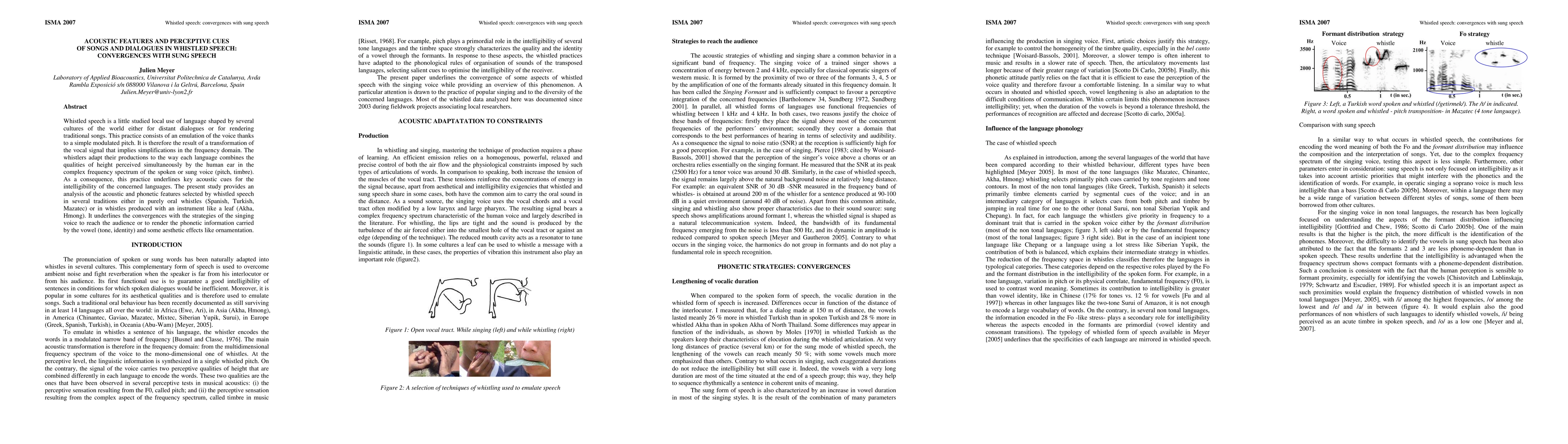 This study analyzes acoustic and phonetic features of whistled speech traditions, comparing them to sung speech. It highlights how whistled speech adapts to convey phonetic information and aesthetic elements, revealing convergences with singing strategies.