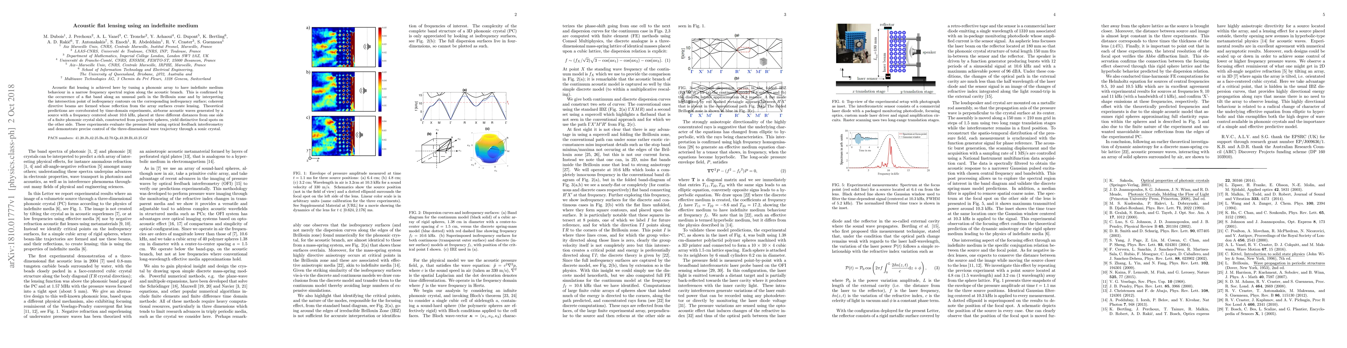 Acoustic flat lensing is achieved here by tuning a phononic array to have indefinite medium behaviour in a narrow frequency spectral region along the acoustic branch. This is confirmed by the occurrence of a flat band along an unusual path in the Brillouin zone and by interpreting the intersection point of isofrequency contours on the corresponding isofrequency surface; coherent directive beams are formed whose reflection from the array surfaces create lensing. Theoretical predictions are corroborated by time-domain experiments, airborne acoustic waves generated by a source with a frequency centered about $10.6$ kHz, placed at three different distances from one side of a finite phononic crystal slab, constructed from polymeric spheres, yield distinctive focal spots on the other side. These experiments evaluate the pressure field using optical feedback interferometry and demonstrate precise control of the three-dimensional wave trajectory through a sonic crystal.
