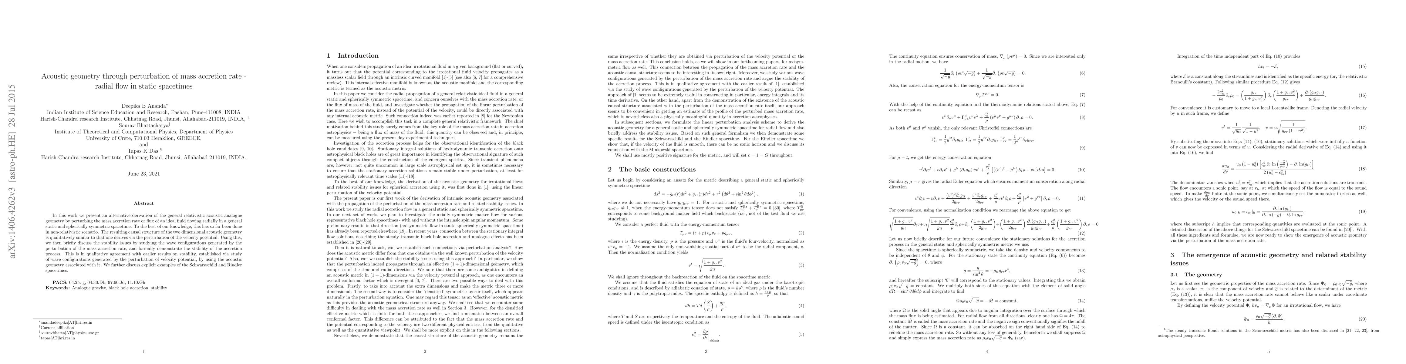In this work we present an alternative derivation of the general relativistic acoustic analogue geometry by perturbing the mass accretion rate or flux of an ideal fluid flowing radially in a general static and spherically symmetric spacetime. To the best of our knowledge, this has so far been done in non-relativistic scenario. The resulting causal structure of the two dimensional acoustic geometry is qualitatively similar to that one derives via the perturbation of the velocity potential. Using this, we then briefly discuss the stability issues by studying the wave configurations generated by the perturbation of the mass accretion rate, and formally demonstrate the stability of the accretion process. This is in qualitative agreement with earlier results on stability, established via study of wave configurations generated by the perturbation of velocity potential, by using the acoustic geometry associated with it. We further discuss explicit examples of the Schwarzschild and Rindler spacetimes.