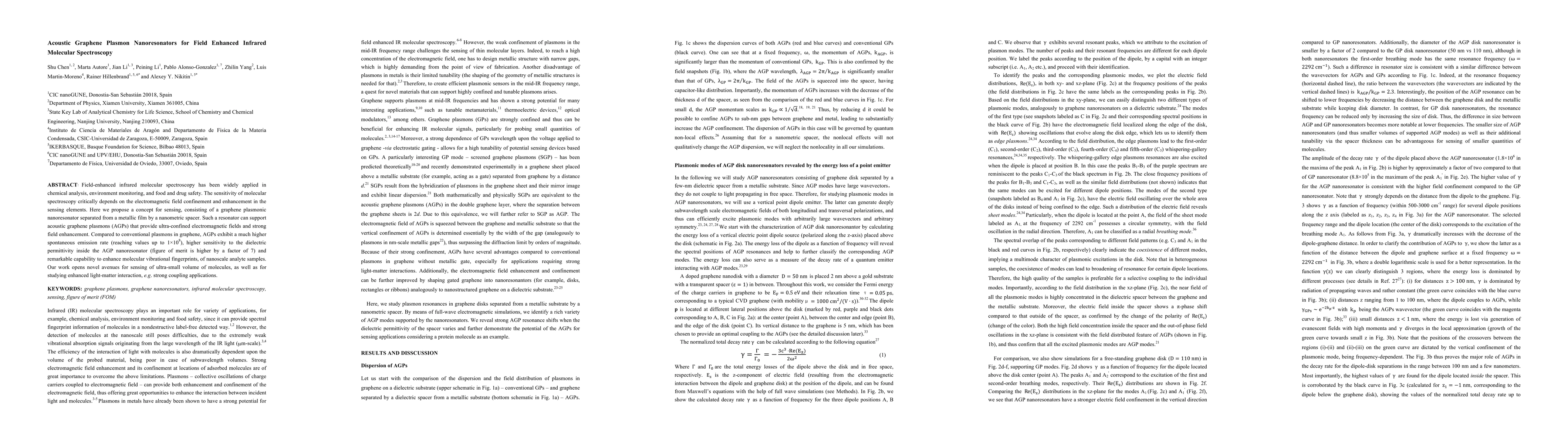 This paper proposes graphene plasmonic nanoresonators supporting acoustic graphene plasmons (AGPs) for field-enhanced infrared molecular spectroscopy, offering ultra-confined electromagnetic fields and higher sensitivity for chemical analysis and safety monitoring. AGPs provide superior spontaneous emission rates and enhanced molecular vibrational fingerprints compared to conventional plasmons.
