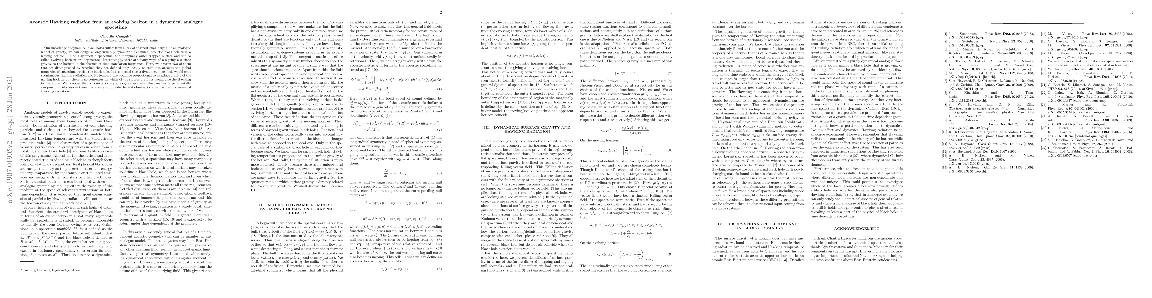 Our knowledge of dynamical black holes suffers from a lack of observational insight. In an analogue model of gravity, we can design a longitudinally symmetric dynamical acoustic black hole with a moving horizon. In this symmetric spacetime, the marginally outer trapped surface and the so called evolving horizon are degenerate. Interestingly, there are many ways of assigning a surface gravity to the horizon in the absence of time translation invariance. Here, we present two of them that are distinguished by whether they are defined only locally or take into account the global properties of spacetime outside the black hole. It is expected that a dynamical black hole would emit spontaneous thermal radiation and its temperature would be proportional to a surface gravity of the moving horizon but there is no consensus on which of the surface gravities would give the Hawking temperature. We propose that a non-stationary analogue spacetime when realised experimentally can possibly help resolve these mysteries and provide the first observational signatures of dynamical Hawking radiation.