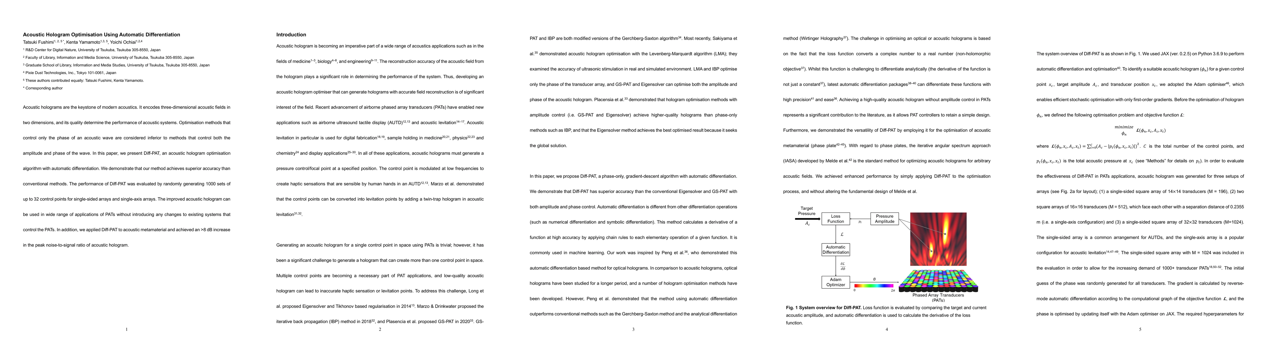 This paper introduces Diff-PAT, an advanced acoustic hologram optimisation algorithm leveraging automatic differentiation, which optimises both amplitude and phase for superior performance. The method was tested on various array configurations, showing significant improvements over conventional methods, particularly in acoustic metamaterials.
