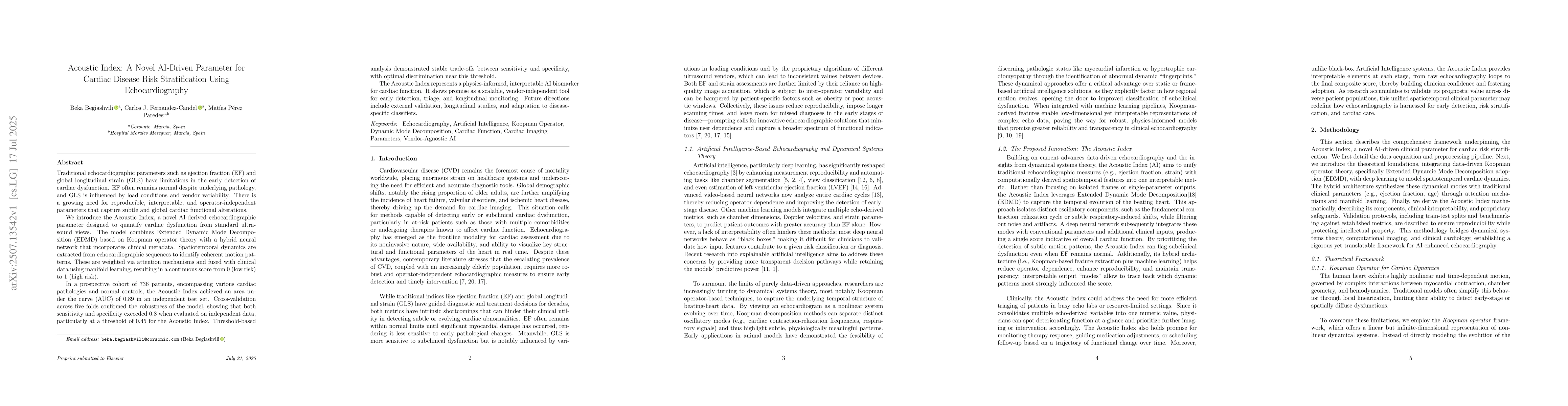 The research introduces the Acoustic Index, an AI-driven parameter derived from echocardiography to assess cardiac disease risk. It surpasses traditional methods like EF and GLS, achieving an AUC of 0.89 in distinguishing various cardiac conditions from normal controls, demonstrating potential for early detection and monitoring.