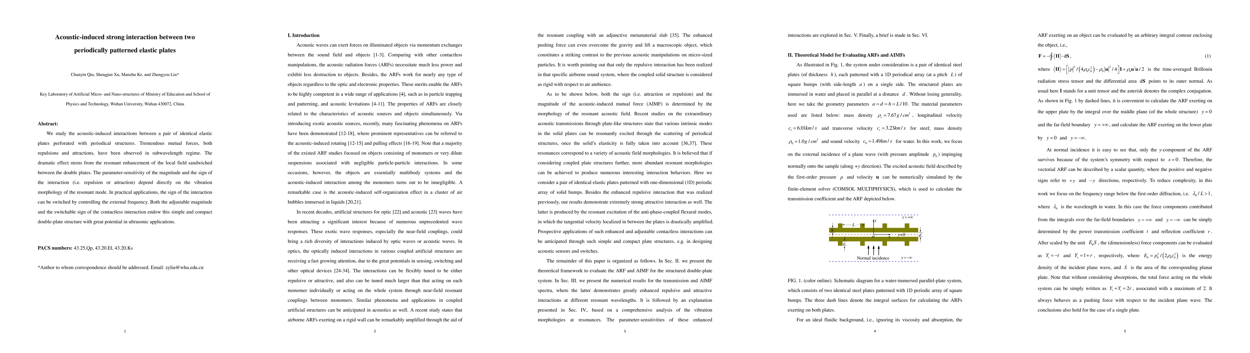 This research investigates the strong acoustic-induced interactions between two periodically patterned elastic plates, revealing significant forces of both repulsion and attraction in the subwavelength regime due to resonant field enhancement. The interaction's magnitude and sign can be controlled by external frequency, promising applications in ultrasonic technology.