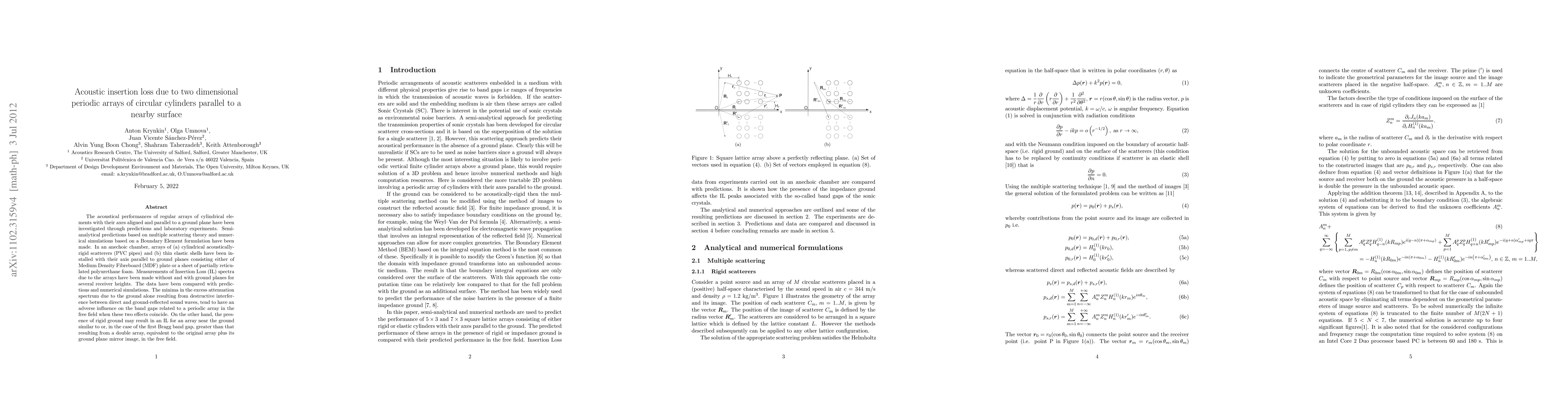 This paper investigates the acoustic insertion loss of two-dimensional periodic arrays of cylindrical elements parallel to a ground plane, comparing semi-analytical predictions, numerical simulations, and laboratory measurements. The study finds that the presence of ground can adversely affect band gaps due to destructive interference, but may also enhance insertion loss near the ground.