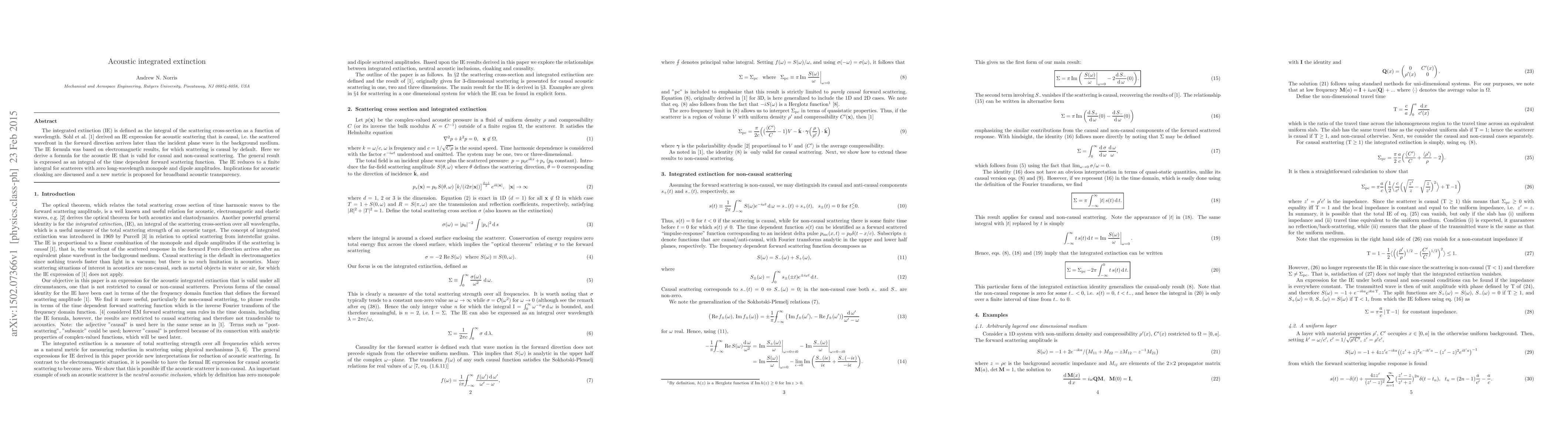 The integrated extinction (IE) is defined as the integral of the scattering cross-section as a function of wavelength. Sohl et al. [1] derived an IE expression for acoustic scattering that is causal, i.e. the scattered wavefront in the forward direction arrives later than the incident plane wave in the background medium. The IE formula was based on electromagnetic results, for which scattering is causal by default. Here we derive a formula for the acoustic IE that is valid for causal and non-causal scattering. The general result is expressed as an integral of the time dependent forward scattering function. The IE reduces to a finite integral for scatterers with zero long-wavelength monopole and dipole amplitudes. Implications for acoustic cloaking are discussed and a new metric is proposed for broadband acoustic transparency.
