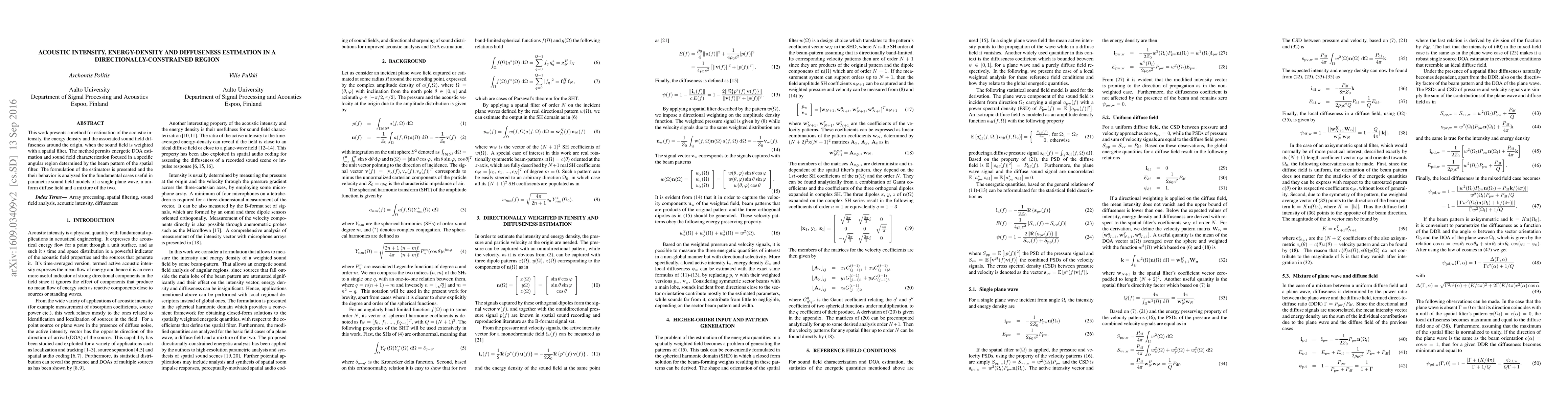 This work presents a method for estimation of the acoustic intensity, the energy density and the associated sound field diffuseness around the origin, when the sound field is weighted with a spatial filter. The method permits energetic DOA estimation and sound field characterization focused in a specific angular region determined by the beam pattern of the spatial filter. The formulation of the estimators is presented and their behavior is analyzed for the fundamental cases useful in parametric sound field models of a single plane wave, a uniform diffuse field and a mixture of the two.