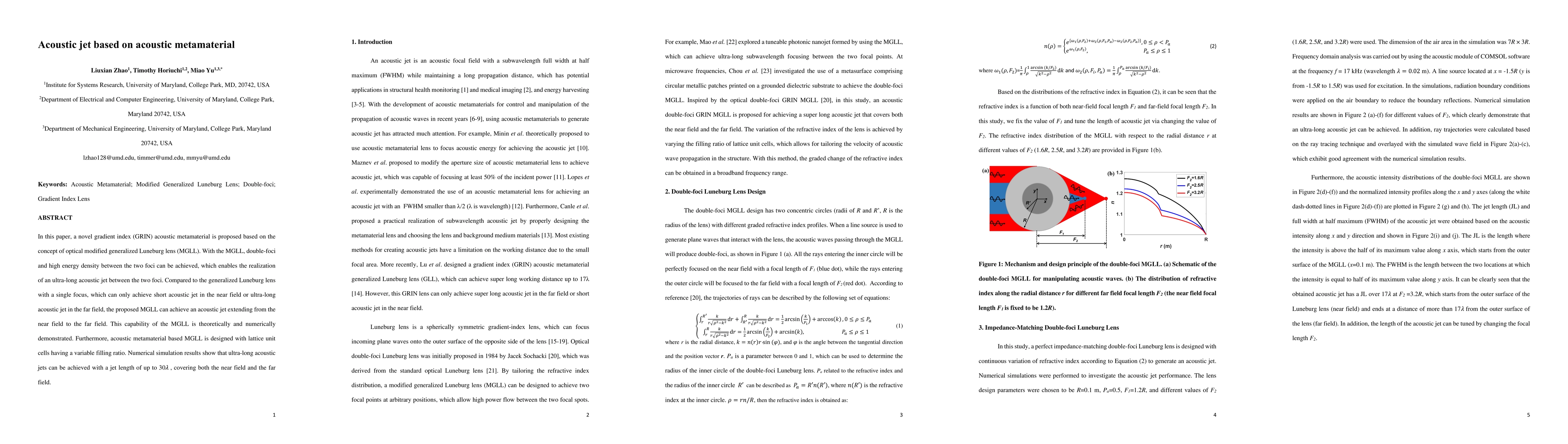 This paper proposes a novel gradient index acoustic metamaterial based on the modified generalized Luneburg lens (MGLL) concept, enabling ultra-long acoustic jets extending from the near field to the far field, with a jet length of up to 30λ, demonstrated through theoretical and numerical simulations.