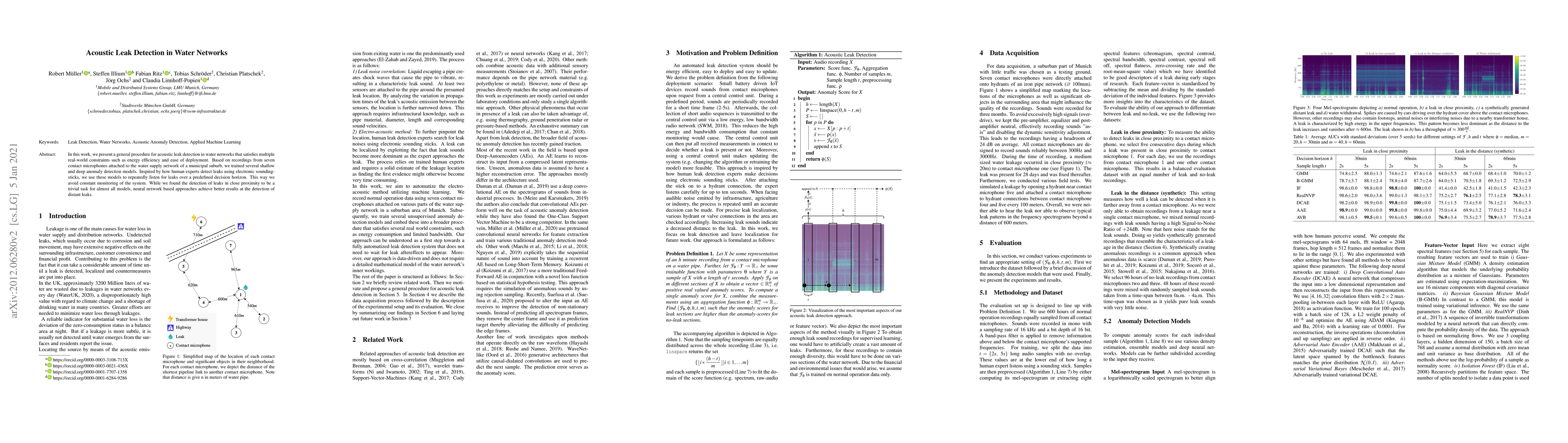 In this work, we present a general procedure for acoustic leak detection in water networks that satisfies multiple real-world constraints such as energy efficiency and ease of deployment. Based on recordings from seven contact microphones attached to the water supply network of a municipal suburb, we trained several shallow and deep anomaly detection models. Inspired by how human experts detect leaks using electronic sounding-sticks, we use these models to repeatedly listen for leaks over a predefined decision horizon. This way we avoid constant monitoring of the system. While we found the detection of leaks in close proximity to be a trivial task for almost all models, neural network based approaches achieve better results at the detection of distant leaks.