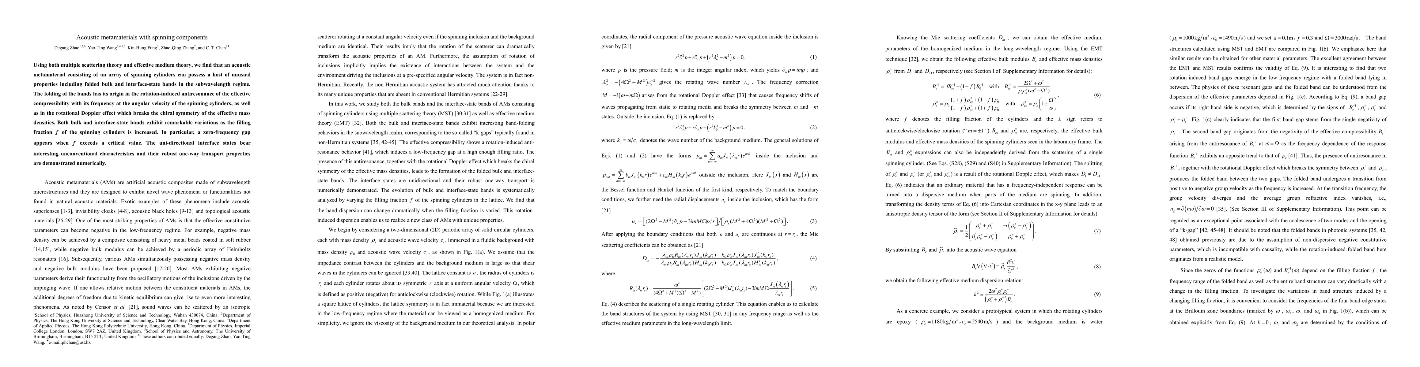 Using both multiple scattering theory and effective medium theory, we find that an acoustic metamaterial consisting of an array of spinning cylinders can possess a host of unusual properties including folded bulk and interface-state bands in the subwavelength regime. The folding of the bands has its origin in the rotation-induced antiresonance of the effective compressibility with its frequency at the angular velocity of the spinning cylinders, as well as in the rotational Doppler effect which breaks the chiral symmetry of the effective mass densities. Both bulk and interface-state bands exhibit remarkable variations as the filling fraction of the spinning cylinders is increased. In particular, a zero-frequency gap appears when exceeds a critical value. The uni-directional interface states bear interesting unconventional characteristics and their robust one-way transport properties are demonstrated numerically.