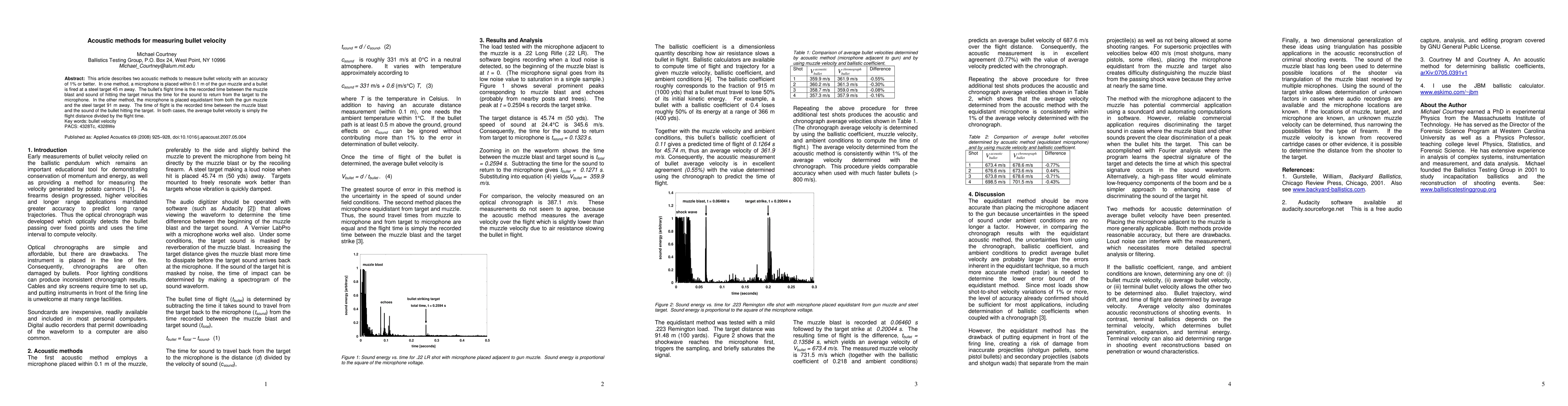 This article describes two acoustic methods to measure bullet velocity with an accuracy of 1% or better. In one method, a microphone is placed within 0.1 m of the gun muzzle and a bullet is fired at a steel target 45 m away. The bullet's flight time is the recorded time between the muzzle blast and sound of hitting the target minus the time for the sound to return from the target to the microphone. In the other method, the microphone is placed equidistant from both the gun muzzle and the steel target 91 m away. The time of flight is the recorded time between the muzzle blast and the sound of the bullet hitting the target. In both cases, the average bullet velocity is simply the flight distance divided by the flight time.