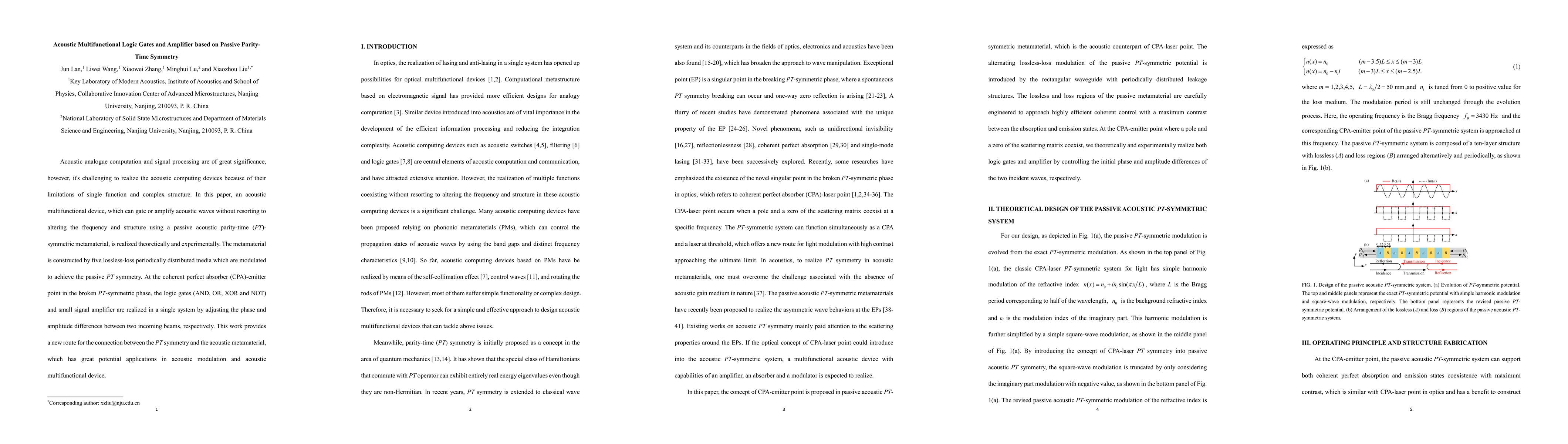 This paper presents an acoustic multifunctional device based on passive parity-time symmetry, capable of gating or amplifying acoustic waves without structural changes. The device, utilizing a PT-symmetric metamaterial, realizes logic gates and amplification by adjusting phase and amplitude differences between incoming beams.