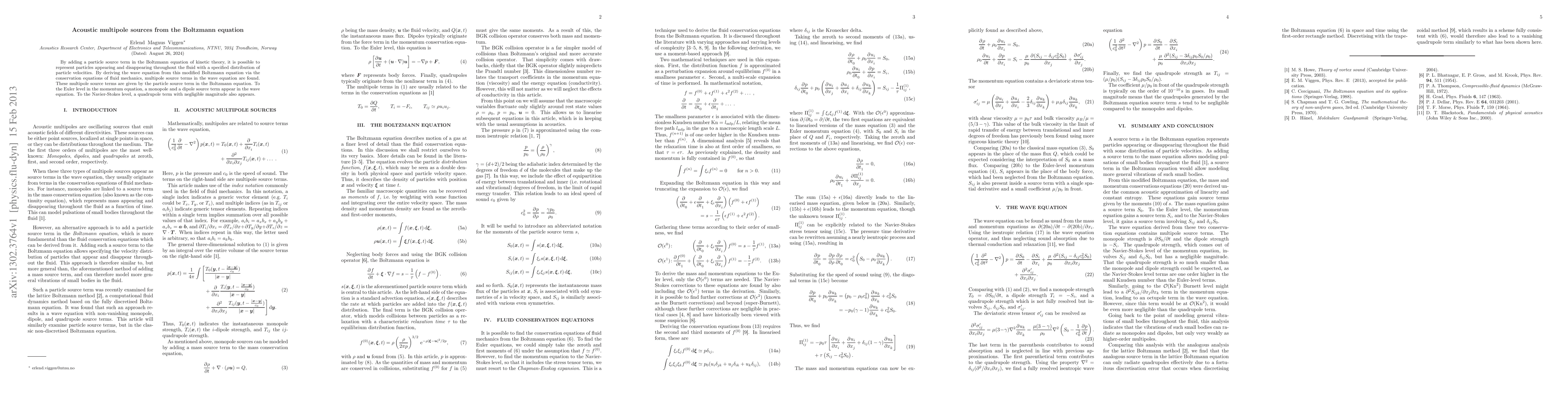 This paper introduces a method to represent acoustic multipole sources in fluid dynamics by modifying the Boltzmann equation to include a particle source term. It derives wave equations from this modified equation, identifying monopole, dipole, and quadrupole source terms corresponding to different levels of fluid mechanics.