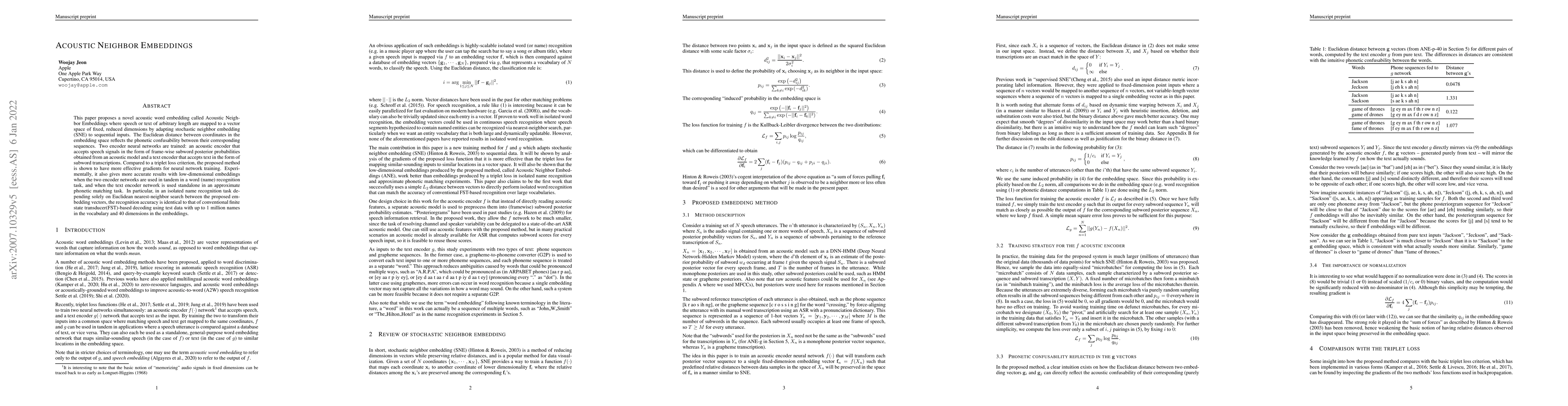 This paper introduces Acoustic Neighbor Embeddings, a method that maps speech or text into a fixed-dimensional vector space using adapted stochastic neighbor embedding, showing effective gradients and higher accuracy in word recognition and phonetic matching tasks. The proposed embeddings achieve recognition accuracy comparable to conventional FST-based decoding in large vocabulary isolated name recognition.