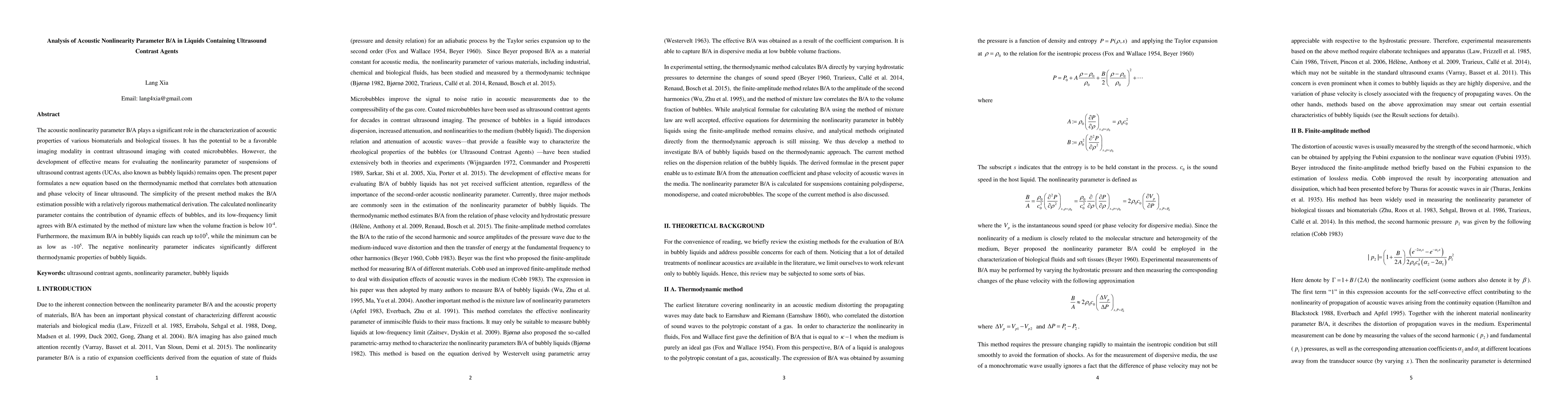 This paper introduces a thermodynamic approach to estimate the acoustic nonlinearity parameter B/A in suspensions of ultrasound contrast agents, providing a new equation that correlates ultrasound attenuation and phase velocity. The method allows for rigorous mathematical derivation and reveals that B/A can range from -105 to 105, indicating diverse thermodynamic properties in bubbly liquids.