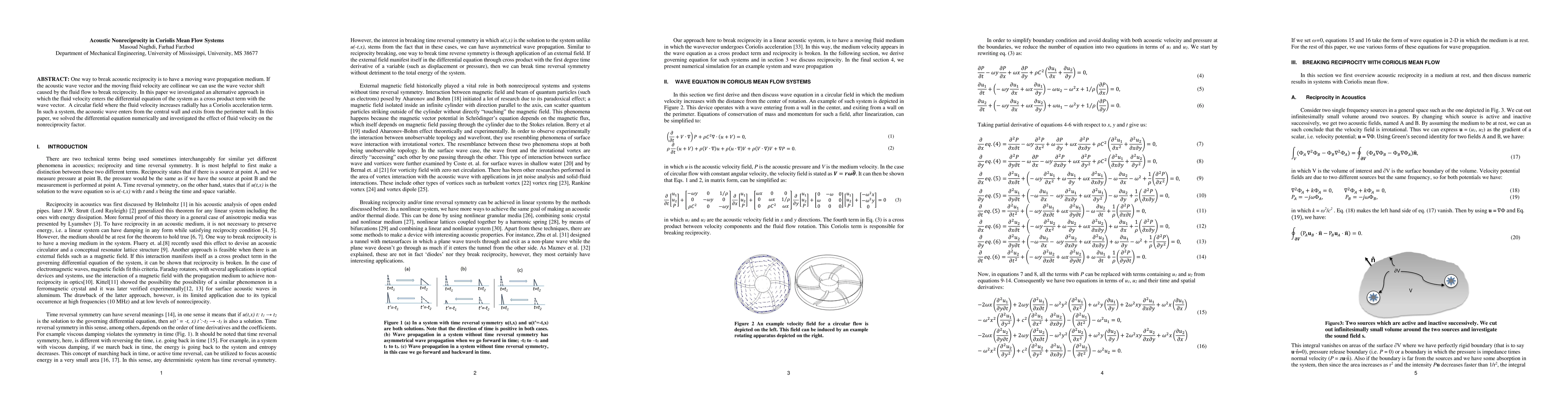 Researchers investigated a method to break acoustic reciprocity in Coriolis mean flow systems by introducing a fluid velocity term into the differential equation, leading to nonreciprocal wave propagation.