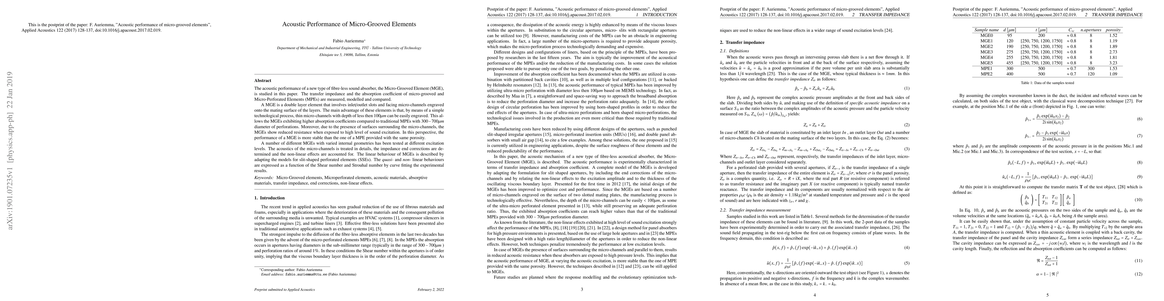 A new type of sound absorber, micro-grooved elements (MGEs), are studied for their acoustic performance, comparing them to traditional micro-perforated elements (MPEs). The research focuses on absorption coefficient, transfer impedance, and cost-effectiveness of MGEs.