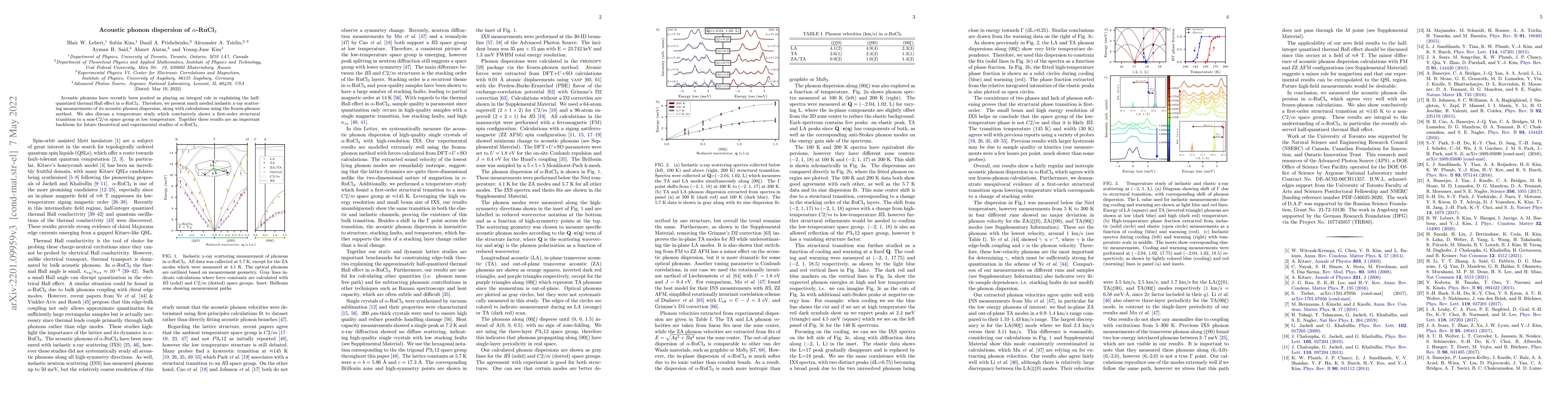 This paper reports inelastic x-ray scattering measurements and calculations of the acoustic phonon dispersion in $\alpha$-RuCl$_3$, crucial for understanding its half-quantized thermal Hall effect. It also reveals a first-order structural transition at low temperatures, providing foundational data for future studies.