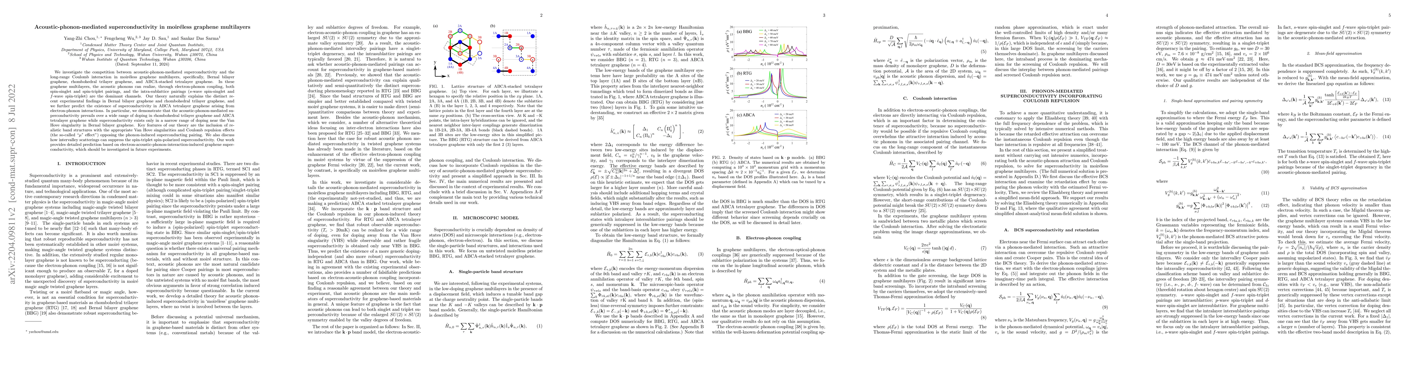 This paper explores the interplay between acoustic-phonon-mediated superconductivity and long-range Coulomb interactions in moiréless graphene multilayers, predicting distinct superconducting behaviors in Bernal bilayer, rhombohedral trilayer, and ABCA tetralayer graphene due to dominant electron-phonon coupling channels.