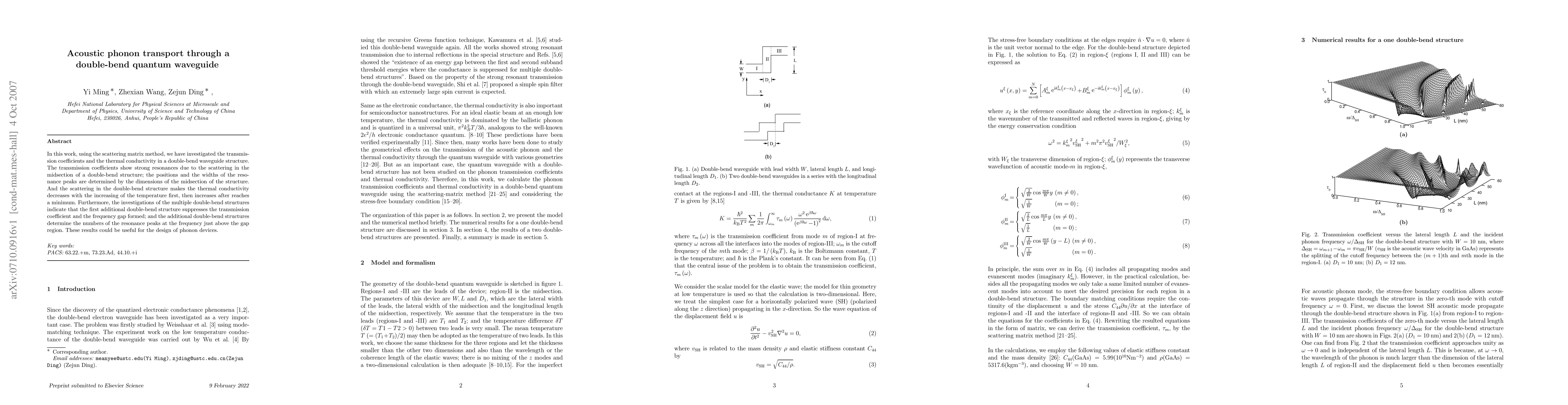 In this work, using the scattering matrix method, we have investigated the transmission coefficients and the thermal conductivity in a double-bend waveguide structure. The transmission coefficients show strong resonances due to the scattering in the midsection of a double-bend structure; the positions and the widths of the resonance peaks are determined by the dimensions of the midsection of the structure. And the scattering in the double-bend structure makes the thermal conductivity decreases with the increasing of the temperature first, then increases after reaches a minimum. Furthermore, the investigations of the multiple double-bend structures indicate that the first additional double-bend structure suppresses the transmission coefficient and the frequency gap formed; and the additional double-bend structures determine the numbers of the resonance peaks at the frequency just above the gap region. These results could be useful for the design of phonon devices.