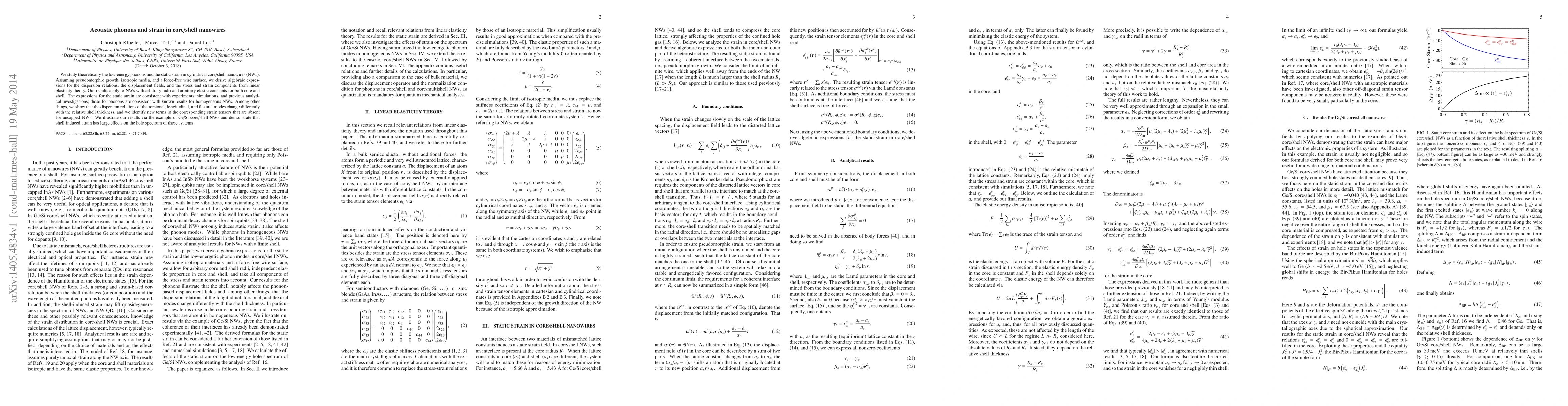 This paper theoretically investigates low-energy phonons and static strain in cylindrical core/shell nanowires under pseudomorphic growth conditions, deriving expressions for dispersion relations and strain components. It highlights differences in the dispersion relations of various phonon modes relative to shell thickness and identifies new strain tensor terms for core/shell NWs compared to uncapped NWs.