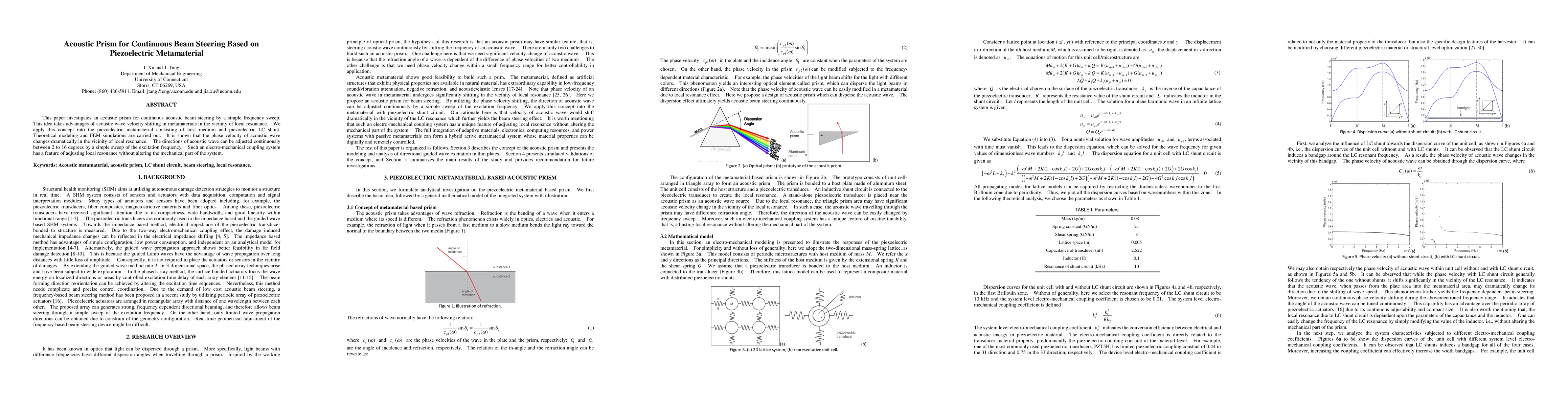This paper proposes an acoustic prism using piezoelectric metamaterials for continuous beam steering via frequency sweep, leveraging velocity shifts near local resonance. The study demonstrates continuous steering between 2 to 16 degrees without changing the mechanical structure, validated through theoretical modeling and FEM simulations.
