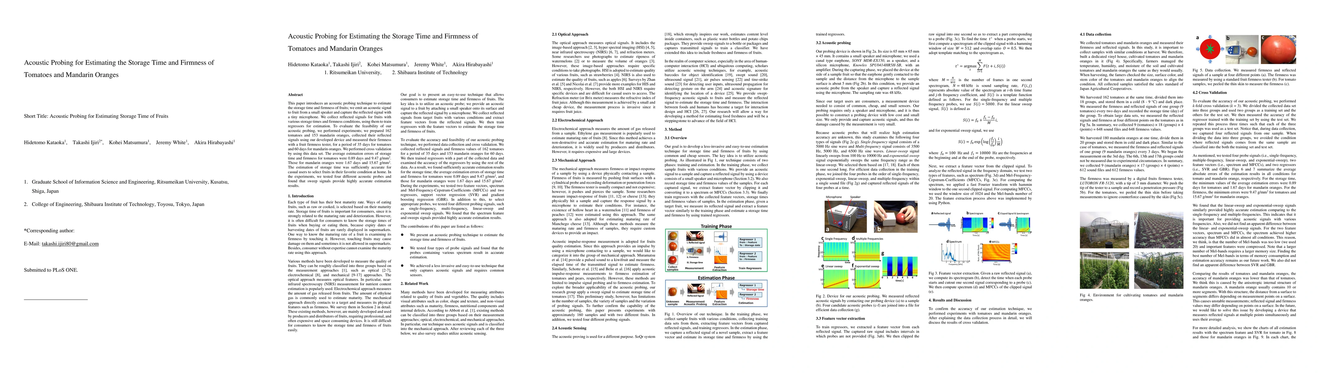 This paper proposes an acoustic probing technique to estimate the storage time and firmness of tomatoes and mandarin oranges by emitting and analyzing reflected acoustic signals. The method achieved average estimation errors of 0.89 days and 9.47 g/mm² for tomatoes, and 1.67 days and 15.67 g/mm² for mandarin oranges, demonstrating its feasibility for home use.
