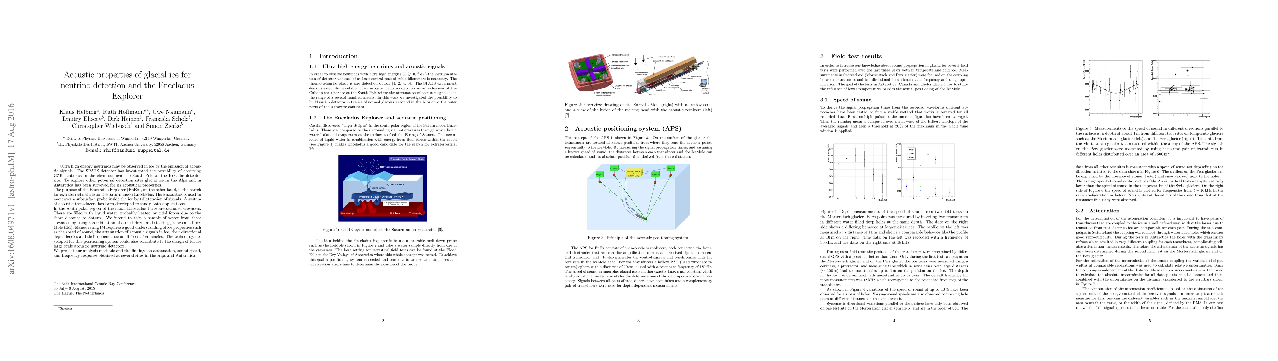 This paper investigates the acoustic properties of glacial ice for both neutrino detection and the Enceladus Explorer mission, focusing on sound speed, attenuation, and frequency response. The SPATS detector aims to observe ultra-high energy neutrinos in ice, while the Enceladus Explorer uses acoustics to maneuver a subsurface probe on Saturn's moon. Findings from Alpine and Antarctic ice surveys inform both applications.
