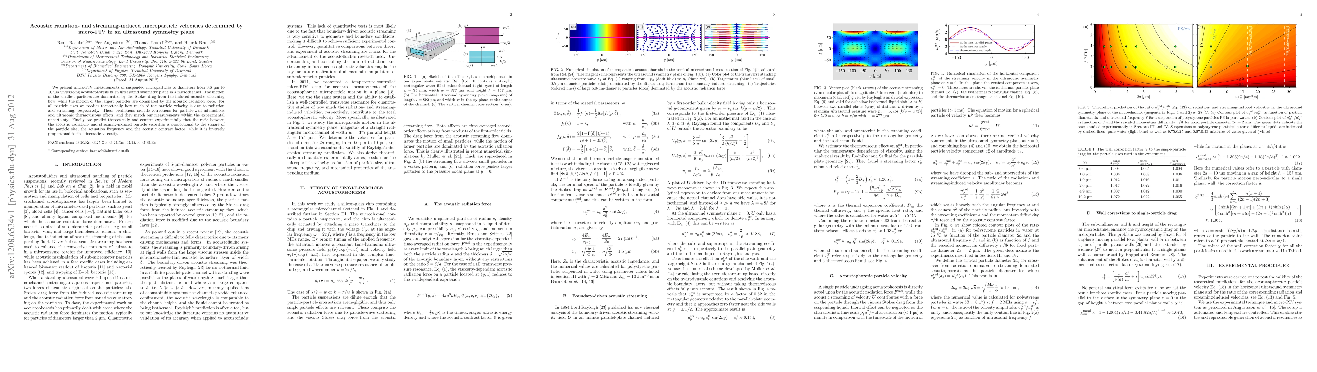 This paper presents micro-PIV measurements of microparticle velocities in an ultrasound symmetry plane, showing that smaller particles are influenced by acoustic streaming while larger ones are dominated by radiation force. The study theoretically predicts and experimentally confirms the proportional relationship between particle velocity and particle size, frequency, and acoustic contrast factor.
