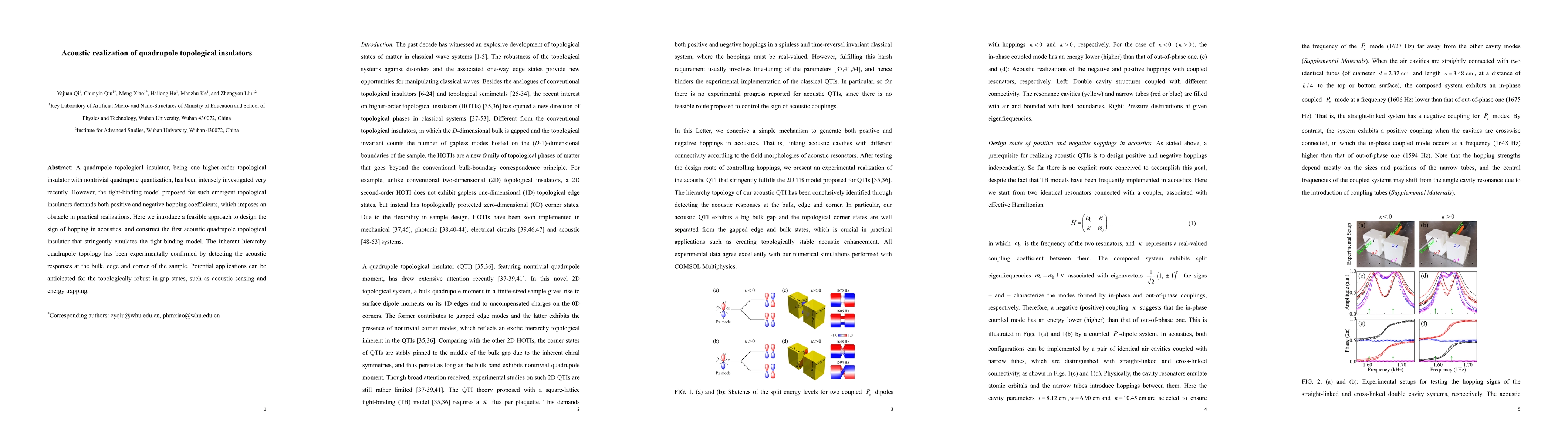 This research introduces an acoustic model to realize a quadrupole topological insulator, overcoming the challenge of required positive and negative hopping coefficients. Experimental verification confirms its inherent quadrupole topology, with potential applications in acoustic sensing and energy trapping.