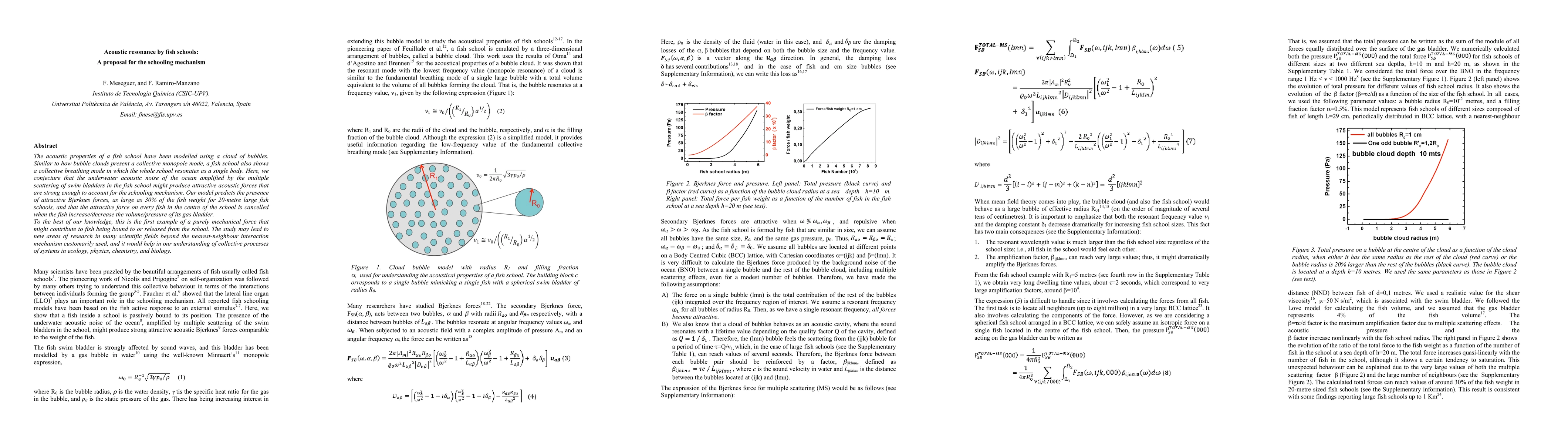 This paper proposes that fish schools exhibit acoustic resonance through a collective breathing mode, akin to bubble clouds, and suggests that amplified underwater acoustic noise from swim bladders could generate attractive Bjerknes forces that help maintain school cohesion. This novel mechanical force mechanism could revolutionize understanding of collective behaviors in various fields.