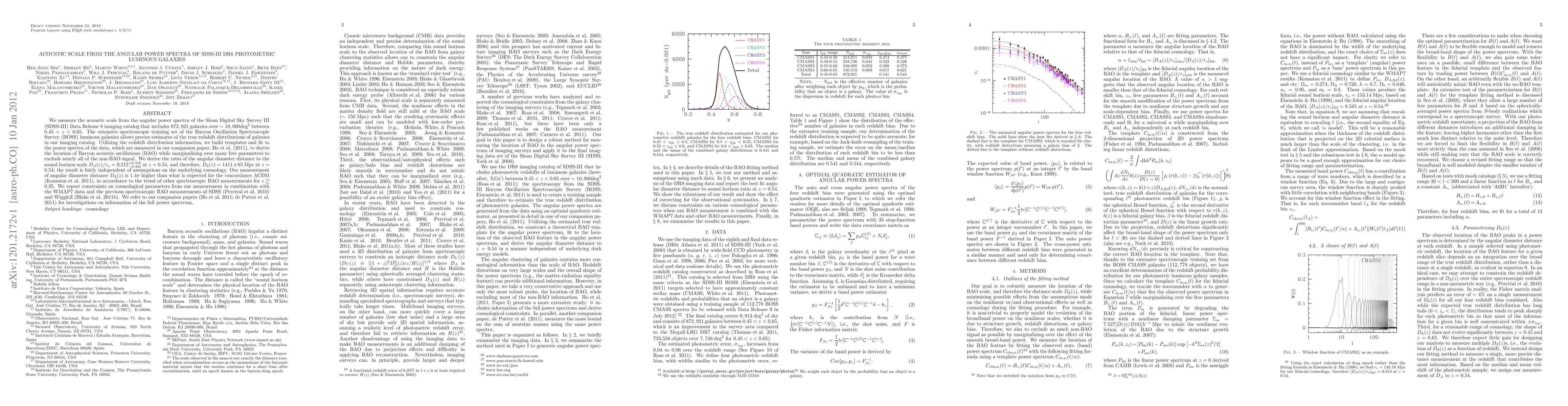 This paper measures the acoustic scale from the angular power spectra of SDSS-III DR8 photometric luminous galaxies, deriving the ratio D_A/r_s=9.212±0.416 at z=0.54, which is 1.4 σ higher than the concordance LCDM model predictions. The results provide constraints on cosmological parameters when combined with WMAP7 and previous spectroscopic BAO measurements.