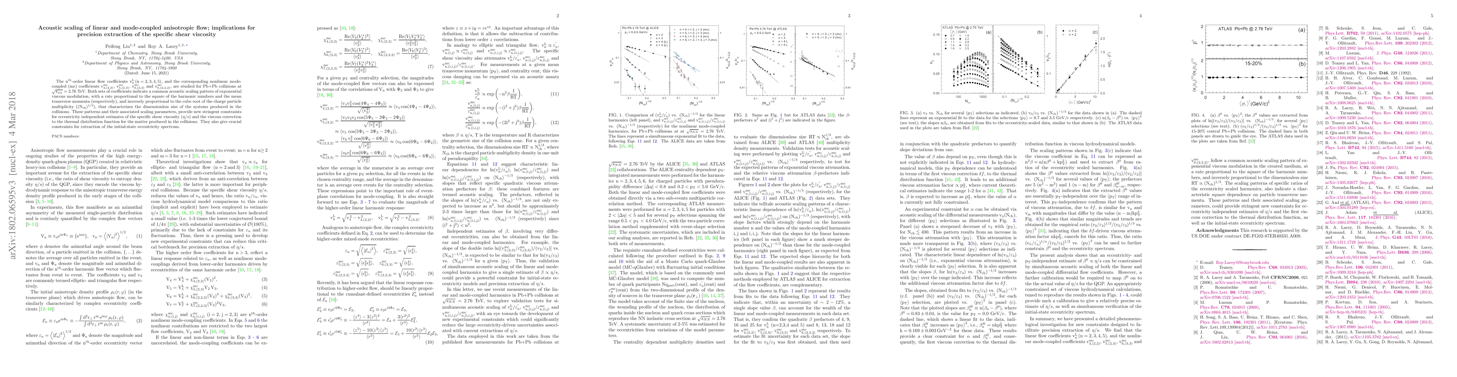 The $\mathrm{n^{th}}$-order linear flow coefficients $\mathrm{v^L_n \, (n=2,3,4,5)}$, and the corresponding nonlinear mode-coupled ($\mathrm{mc}$) coefficients $\mathrm{v^{mc}_{4,(2,2)}}$, $\mathrm{v^{mc}_{5,(2,3)}}$, $\mathrm{v^{mc}_{6,(3,3)}}$ and $\mathrm{v^{mc}_{6,(2,2,2)}}$, are studied for Pb+Pb collisions at $\sqrt{s_{_{\rm NN}}} = 2.76$ TeV. Both sets of coefficients indicate a common acoustic scaling pattern of exponential viscous modulation, with a rate proportional to the square of the harmonic numbers and the mean transverse momenta (respectively), and inversely proportional to the cube root of the charged particle multiplicity ($\mathrm{(N_{ch})^{1/3}}$), that characterizes the dimensionless size of the systems produced in the collisions. These patterns and their associated scaling parameters, provide new stringent constraints for eccentricity independent estimates of the specific shear viscosity ($\eta/s$) and the viscous correction to the thermal distribution function for the matter produced in the collisions. They also give crucial constraints for extraction of the initial-state eccentricity spectrum.