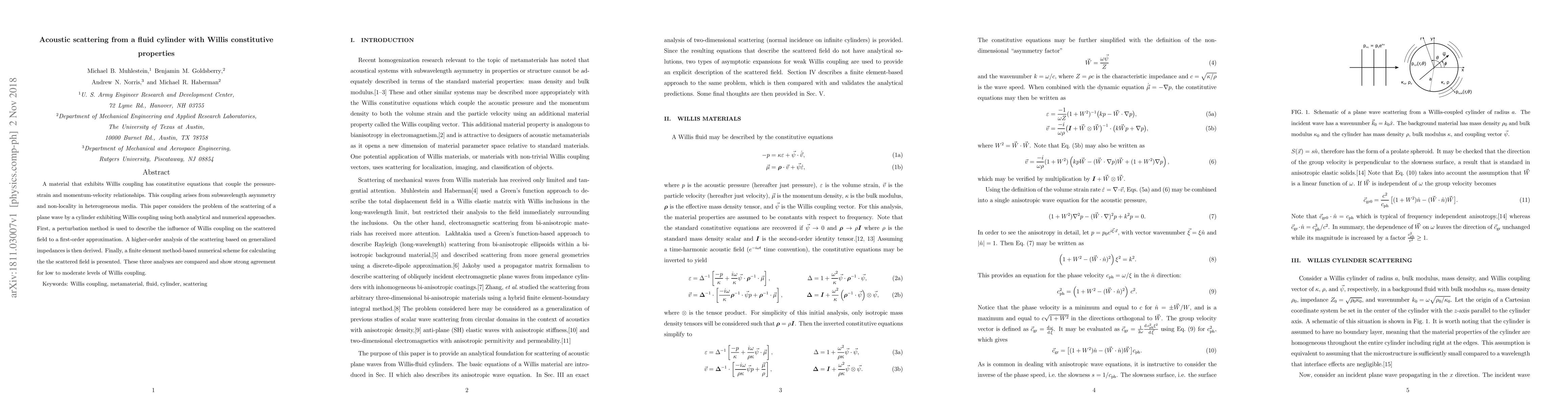 This paper investigates the scattering of plane waves by a fluid cylinder with Willis constitutive properties, employing both analytical and numerical methods. Analytical approaches include perturbation methods and generalized impedances, while a finite element method is used for numerical simulations, demonstrating strong agreement across analyses.