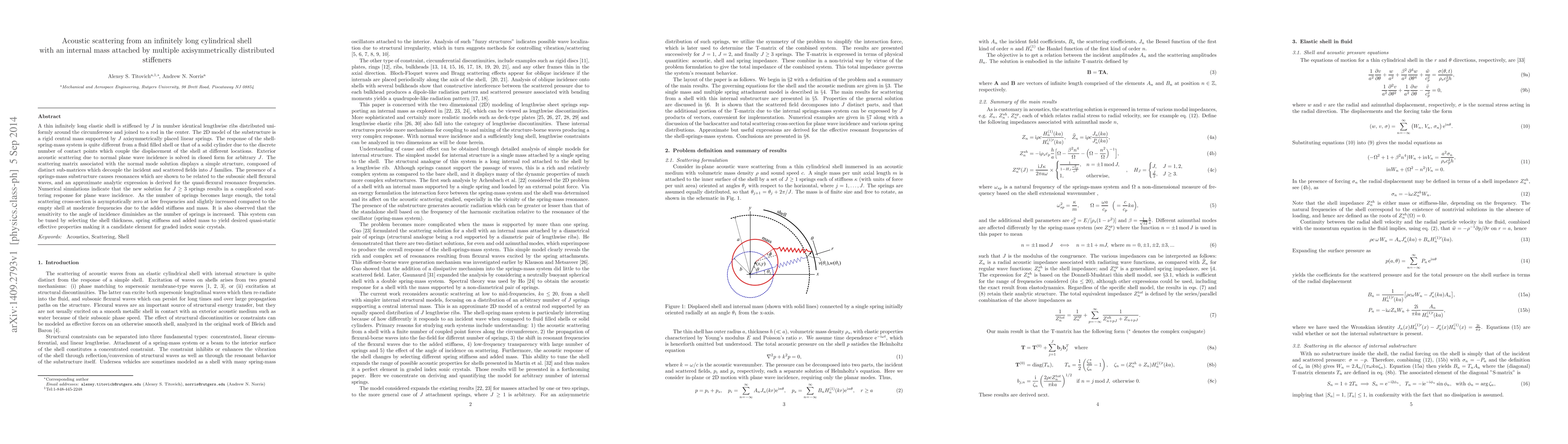 A thin infinitely long elastic shell is stiffened by $J$ in number identical lengthwise ribs distributed uniformly around the circumference and joined to a rod in the center. The 2D model of the substructure is a rigid central mass supported by $J$ axisymmetrically placed linear springs. The response of the shell-spring-mass system is quite different from a fluid filled shell or that of a solid cylinder due to the discrete number of contact points which couple the displacement of the shell at different locations. Exterior acoustic scattering due to normal plane wave incidence is solved in closed form for arbitrary $J$. The scattering matrix associated with the normal mode solution displays a simple structure, composed of distinct sub-matrices which decouple the incident and scattered fields into $J$ families. The presence of a springs-mass substructure causes resonances which are shown to be related to the subsonic shell flexural waves, and an approximate analytic expression is derived for the quasi-flexural resonance frequencies. Numerical simulations indicate that the new solution for $J\ge 3$ springs results in a complicated scattering response for plane wave incidence. As the number of springs becomes large enough, the total scattering cross-section is asymptotically zero at low frequencies and slightly increased compared to the empty shell at moderate frequencies due to the added stiffness and mass. It is also observed that the sensitivity to the angle of incidence diminishes as the number of springs is increased. This system can be tuned by selecting the shell thickness, spring stiffness and added mass to yield desired quasi-static effective properties making it a candidate element for graded index sonic crystals.
