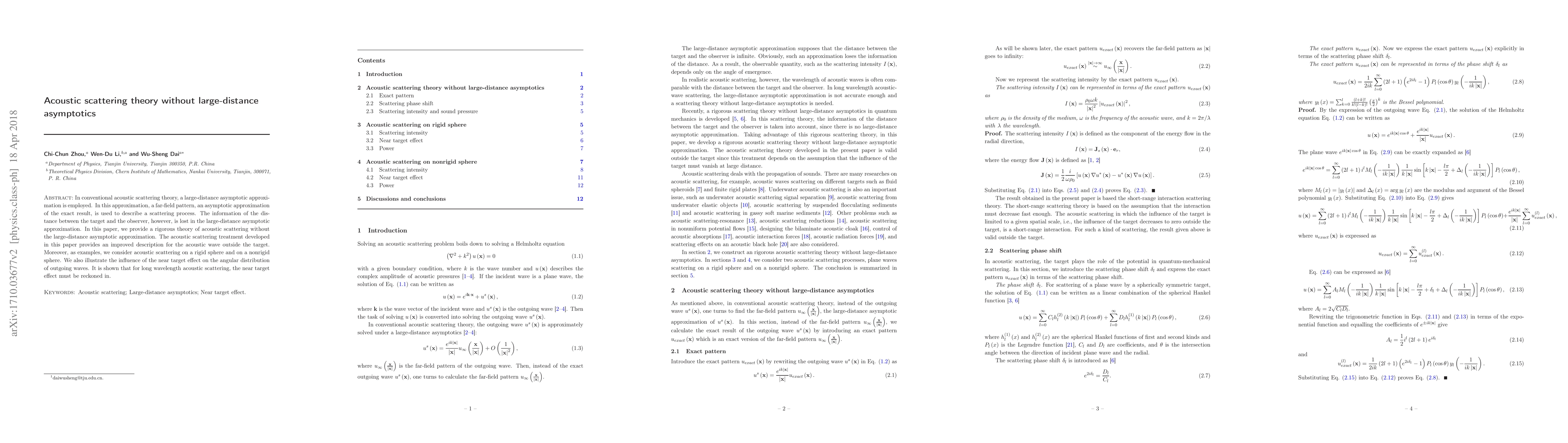 In conventional acoustic scattering theory, a large-distance asymptotic approximation is employed. In this approximation, a far-field pattern, an asymptotic approximation of the exact result, is used to describe a scattering process. The information of the distance between the target and the observer, however, is lost in the large-distance asymptotic approximation. In this paper, we provide a rigorous theory of acoustic scattering without the large-distance asymptotic approximation. The acoustic scattering treatment developed in this paper provides an improved description for the acoustic wave outside the target. Moreover, as examples, we consider acoustic scattering on a rigid sphere and on a nonrigid sphere. We also illustrate the influence of the near target effect on the angular distribution of outgoing waves. It is shown that for long wavelength acoustic scattering, the near target effect must be reckoned in.