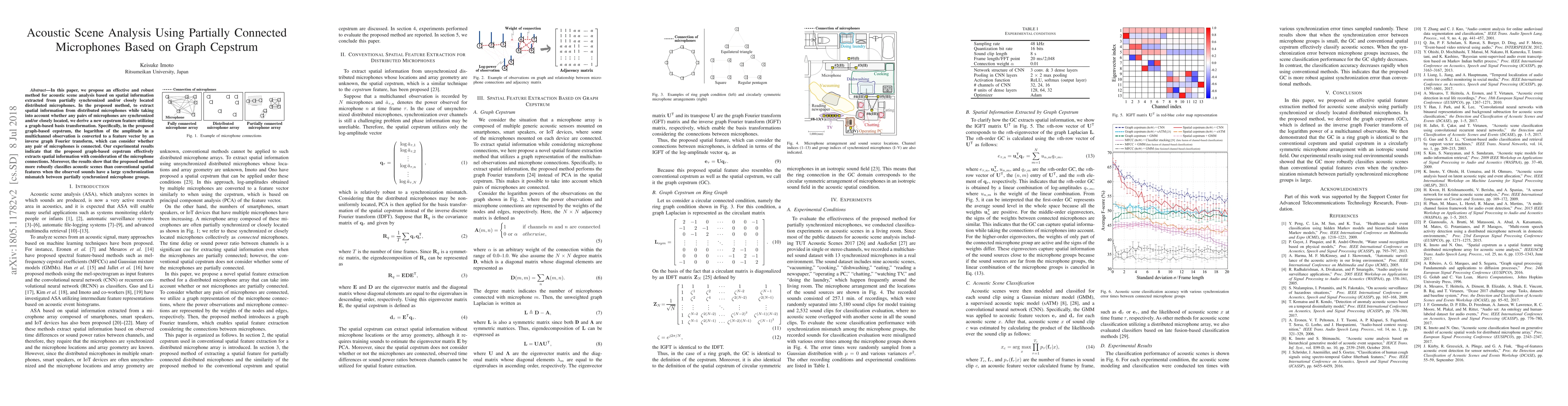 The research proposes a novel spatial feature extraction method for acoustic scene analysis using partially synchronized and/or closely located distributed microphones. It introduces a graph-based cepstrum that considers microphone connections via an inverse graph Fourier transform of multichannel observation log-amplitudes.