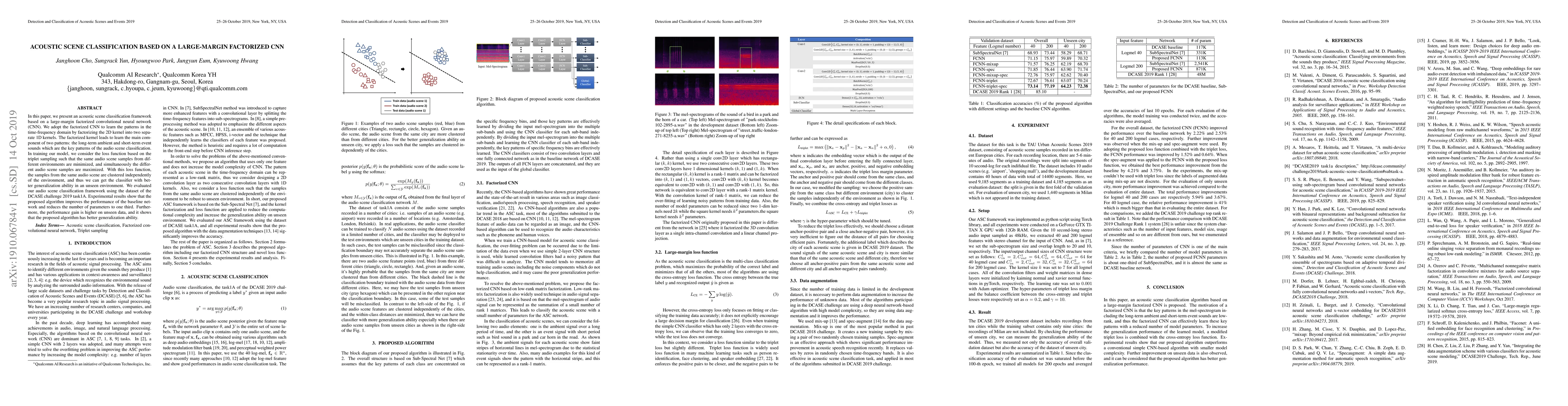 This paper proposes an acoustic scene classification framework using a large-margin factorized CNN that factorizes 2D kernels into 1D kernels to learn long-term ambient and short-term event sounds. The model employs a triplet loss function to improve generalization, achieving better performance and reduced parameters compared to baselines.