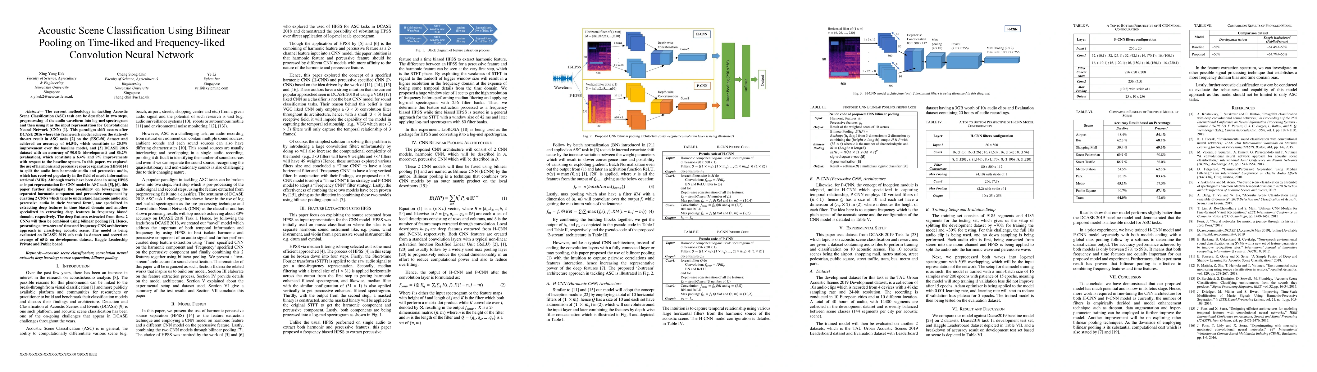 The current methodology in tackling Acoustic Scene Classification (ASC) task can be described in two steps, preprocessing of the audio waveform into log-mel spectrogram and then using it as the input representation for Convolutional Neural Network (CNN). This paradigm shift occurs after DCASE 2016 where this framework model achieves the state-of-the-art result in ASC tasks on the (ESC-50) dataset and achieved an accuracy of 64.5%, which constitute to 20.5% improvement over the baseline model, and DCASE 2016 dataset with an accuracy of 90.0% (development) and 86.2% (evaluation), which constitute a 6.4% and 9% improvements with respect to the baseline system. In this paper, we explored the use of harmonic and percussive source separation (HPSS) to split the audio into harmonic audio and percussive audio, which has received popularity in the field of music information retrieval (MIR). Although works have been done in using HPSS as input representation for CNN model in ASC task, this paper further investigate the possibility on leveraging the separated harmonic component and percussive component by curating 2 CNNs which tries to understand harmonic audio and percussive audio in their natural form, one specialized in extracting deep features in time biased domain and another specialized in extracting deep features in frequency biased domain, respectively. The deep features extracted from these 2 CNNs will then be combined using bilinear pooling. Hence, presenting a two-stream time and frequency CNN architecture approach in classifying acoustic scene. The model is being evaluated on DCASE 2019 sub task 1a dataset and scored an average of 65% on development dataset, Kaggle Leadership Private and Public board.