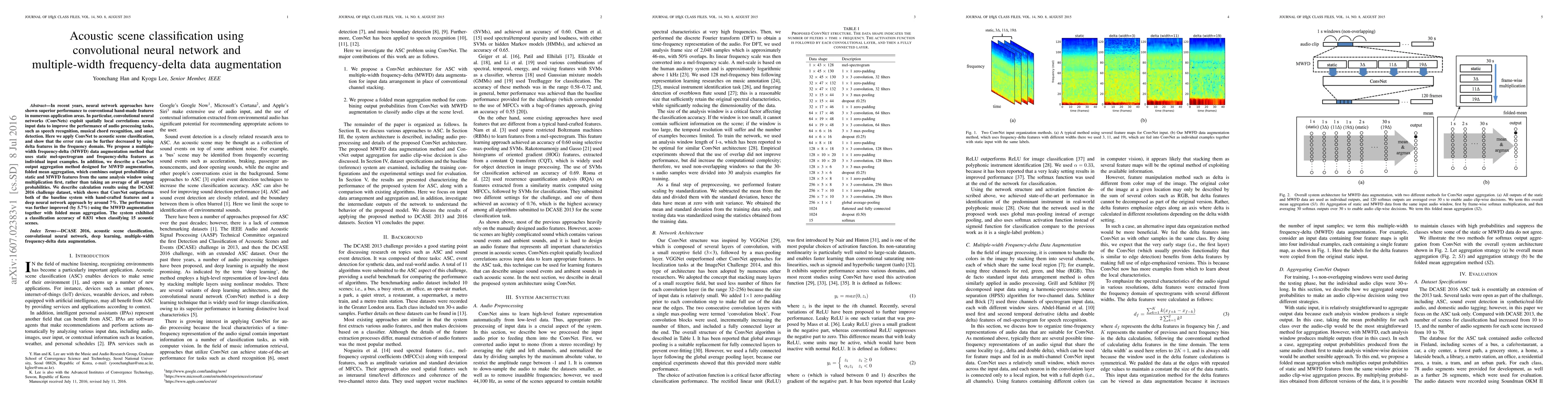 This paper applies convolutional neural networks (ConvNets) to acoustic scene classification, achieving superior performance over baseline methods. It introduces a multiple-width frequency-delta (MWFD) data augmentation technique and a folded mean aggregation method, resulting in a 7% improvement over baselines and a further 5.7% boost when combined, achieving an accuracy of 0.831 on the DCASE 2016 dataset.