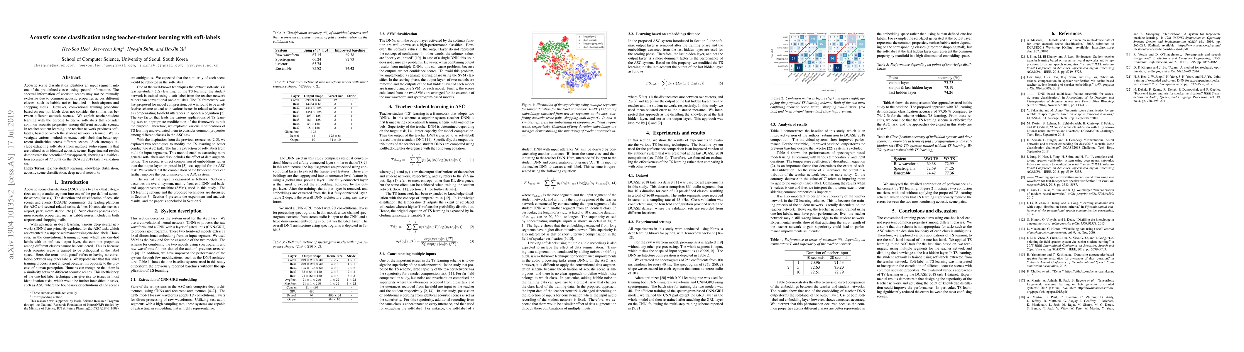 This paper proposes a teacher-student learning method for acoustic scene classification that uses soft-labels to account for similarities between different scenes. Experimental results show an accuracy of 77.36% on the DCASE 2018 task 1 validation set, demonstrating the effectiveness of the approach.