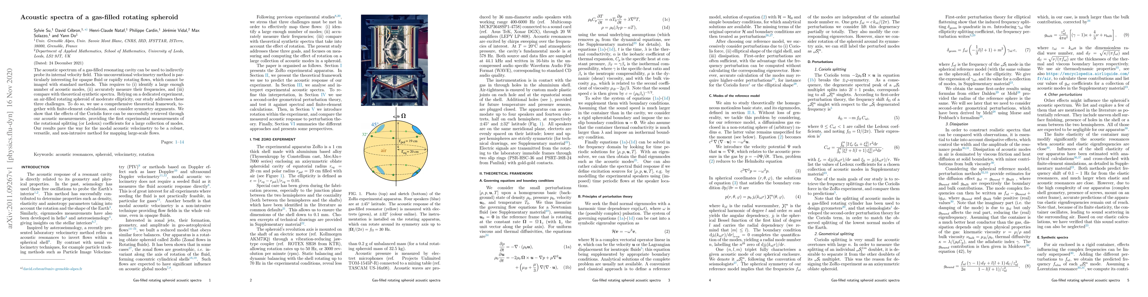 The acoustic spectrum of a gas-filled resonating cavity can be used to indirectly probe its internal velocity field. This unconventional velocimetry method is particularly interesting for opaque fluid or rapidly rotating flows, which cannot be imaged with standard methods. This requires to (i) identify a large enough number of acoustic modes, (ii) accurately measure their frequencies, and (iii) compare with theoretical synthetic spectra. Relying on a dedicated experiment, an air-filled rotating spheroid of moderate ellipticity, our study addresses these three challenges. To do so, we use a comprehensive theoretical framework, together with finite-element calculations, and consider symmetry arguments. We show that the effects of the Coriolis force can be successfully retrieved through our acoustic measurements, providing the first experimental measurements of the rotational splitting (or Ledoux) coefficients for a large collection of modes. Our results pave the way for the modal acoustic velocimetry to be a robust, versatile, and non-intrusive method for mapping large-scale flows. Pages: 1-14