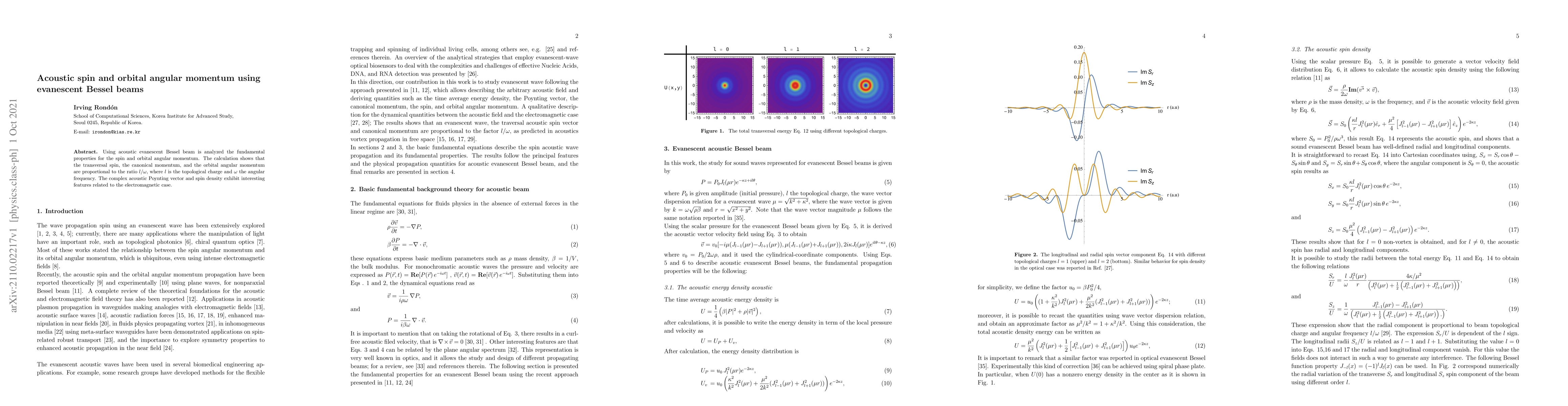 Using acoustic evanescent Bessel beam is analyzed the fundamental properties for the spin and orbital angular momentum. The calculation shows that the transversal spin, the canonical momentum, and the orbital angular momentum are proportional to the ratio $l/\omega$, where $l$ is the topological charge and $\omega$ the angular frequency. The complex acoustic Poynting vector and spin density exhibit interesting features related to the electromagnetic case.