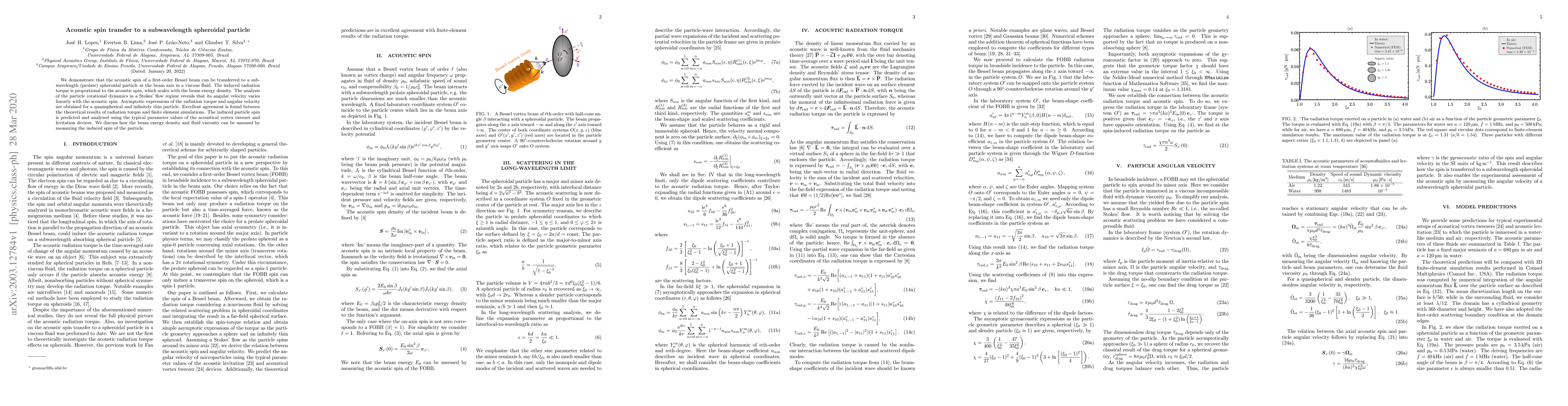 The paper presents a detailed theoretical framework for understanding the transfer of acoustic spin to subwavelength spheroidal particles, including expressions for radiation torque and particle angular velocity.